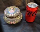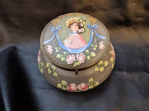A vendre est un pot de poudre en verre satine avec ruban de fleurs et chapeau de dame peint a la main victorien avec couvercle a charniere. Pas de puces ou de fissures.
