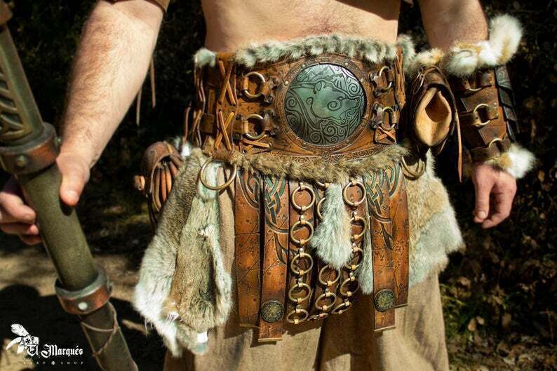 This amazing warbelt, handcrafted with premium quality 2,5-3,5 thickness leather, with in brass details and in golden painted leather, rabbit fur in the edges and a gorgeous engraved steel center plate, will help you to bring on with you the fury of the gods of war into the battlefield.