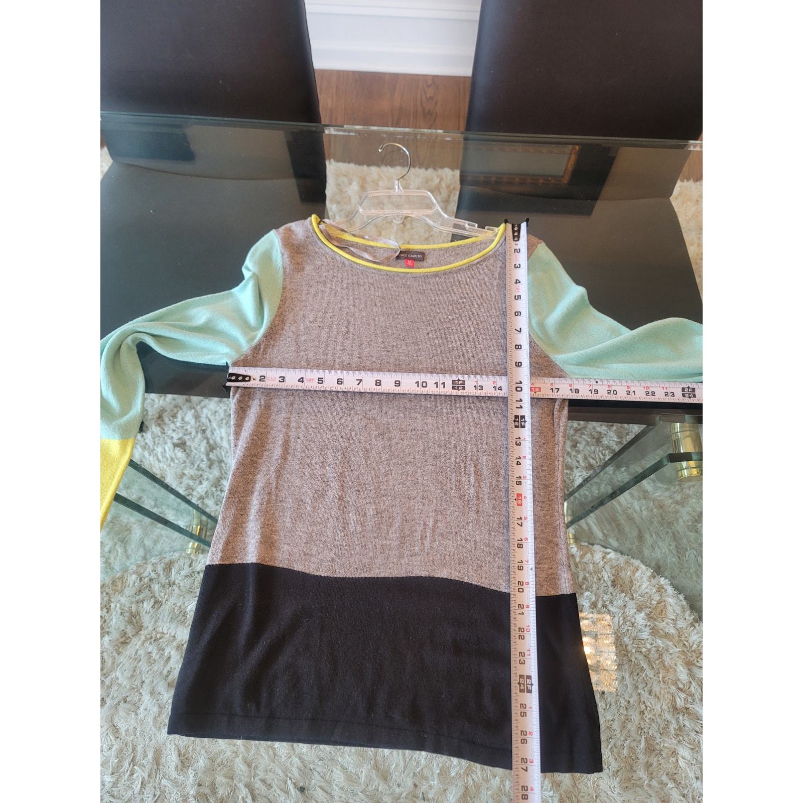 Vince Camuto women?s colorblock sweater in size medium blends comfort and sophistication. Featuring a chic mix of gray, black, mint green, and yellow with long sleeves and a lightweight knit, it?s perfect for layering or wearing on its own. Crafted from an acrylic nylon wool blend, it offers both softness and durability.