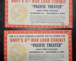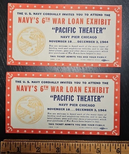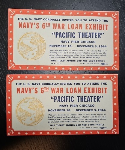 UP FOR SALE: Lot of 2 Vintage 1944 Navy's 6th War Loan Exhibit "PACIFIC THEATER" Navy Pier Chicago November 18...December 3,1944 Event Ticket PLEASE REFER TO ALL PHOTOS FOR A BETTER VISUAL DESCRIPTION OF THE ITEM *Vintage and secondhand items may have flaws. Please review item(s), description and picture(s). I do my best to research and describe the items accurately, but I am not an expert on all of the items I sell. Unless specified in the listing, all items are sold AS-IS AS-SEEN in photos* All of My Items Come from a Smoke Free Home and have been cleaned per's standards I do Ship everyday Monday - Saturday Feel Free to Visit My Store and Browse Through My Other Listings as I am happy to combine shipping for you. Please contact me with any issues prior to leaving negative/neutral feedback or low detail ratings, as I will always do my best to solve any problems that may come up! If you have any further questions, please feel free to message me Any props that are used in the taking of the photos are not included. Only the item/items in the title of the listings are being sold