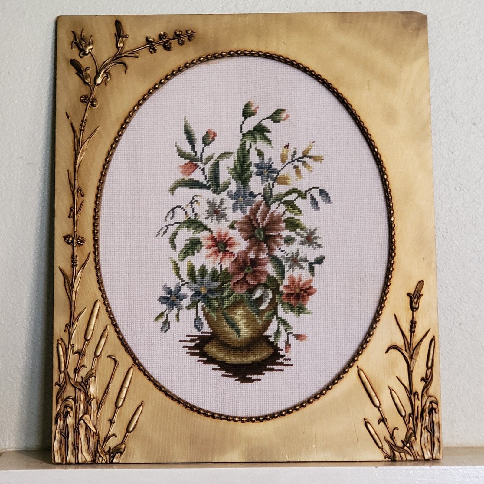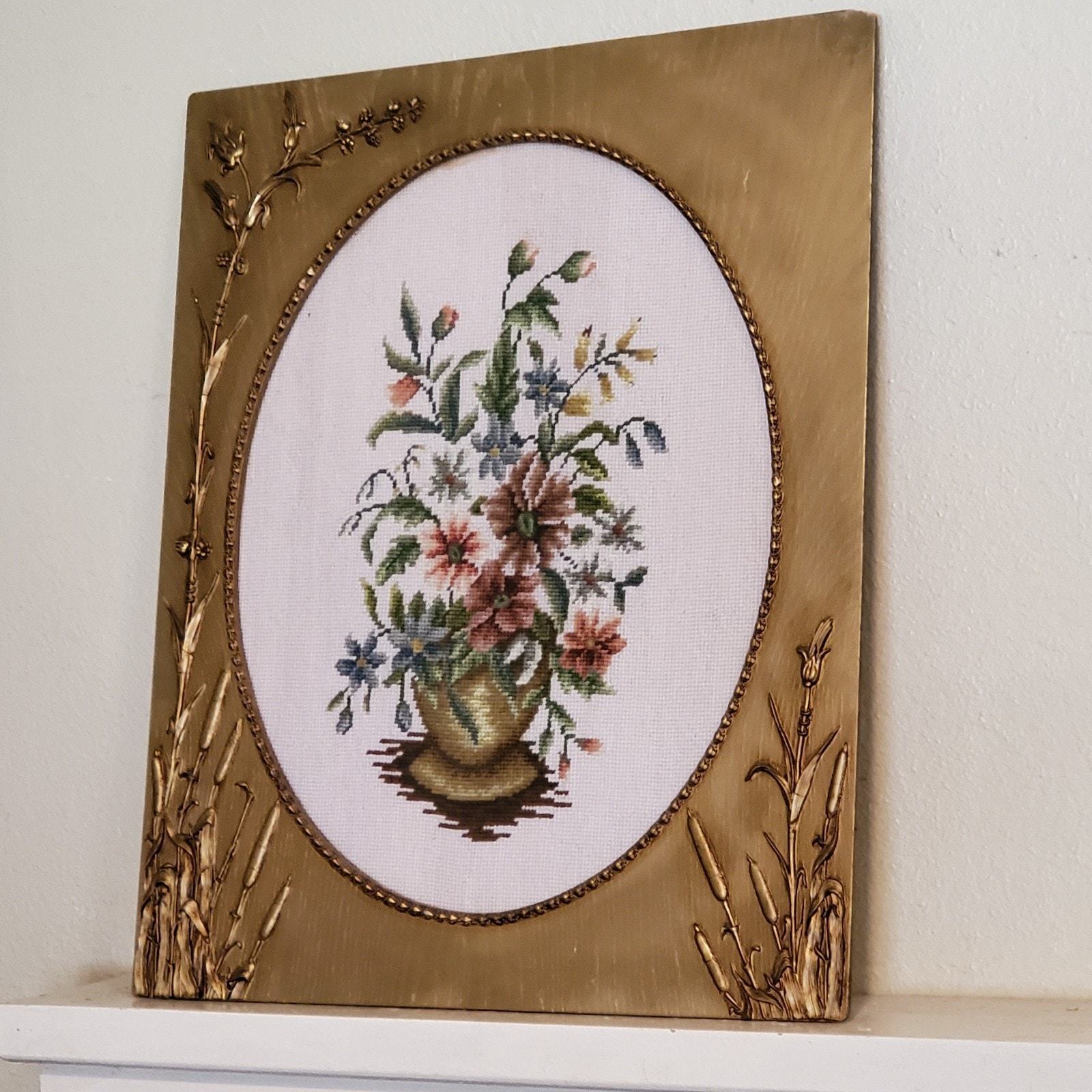 - Vintage 1959 Handmade Still Life Needlepoint In Antique 1895 Frame 25x20 Inch