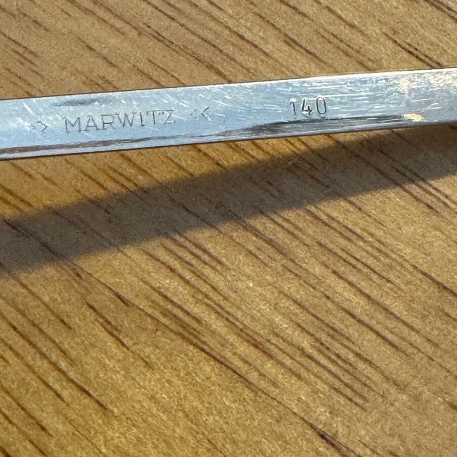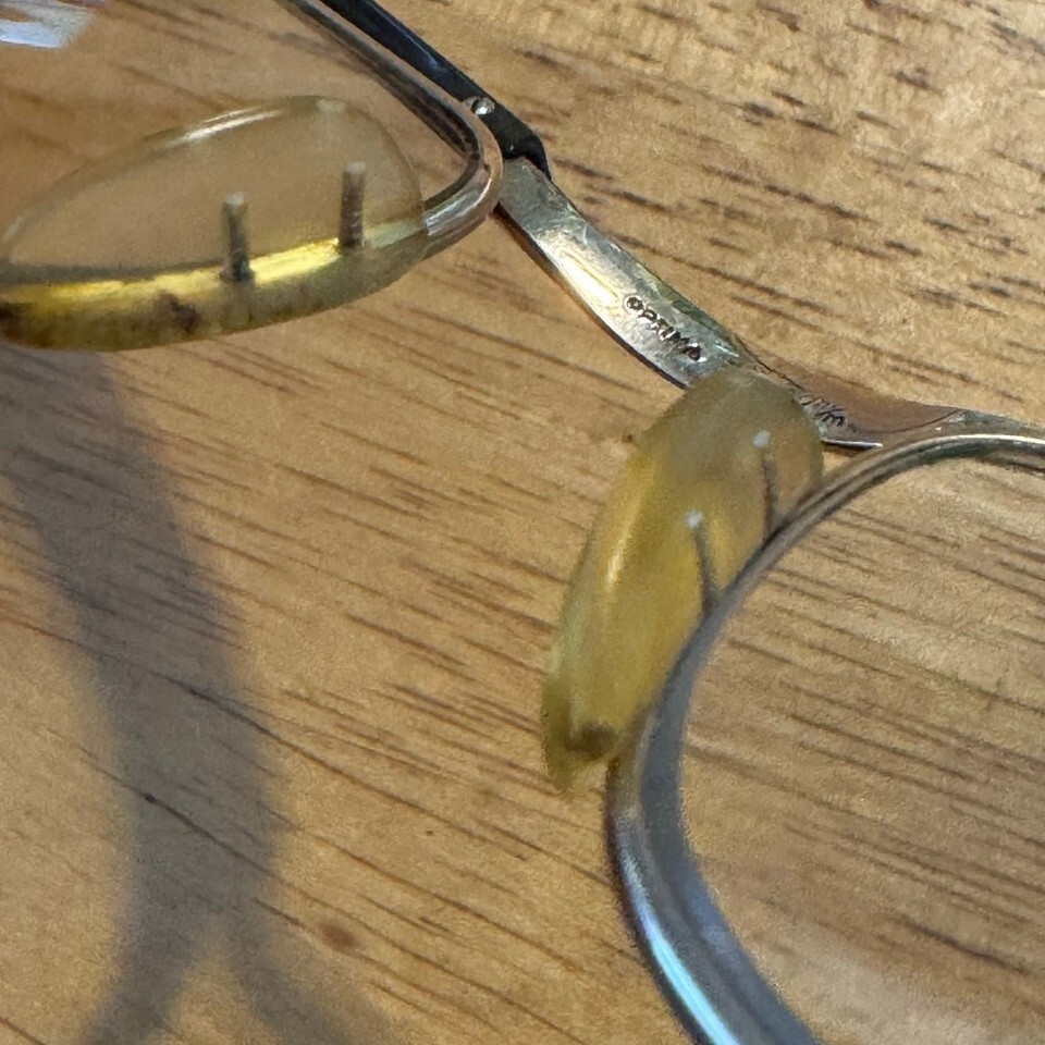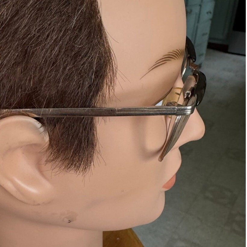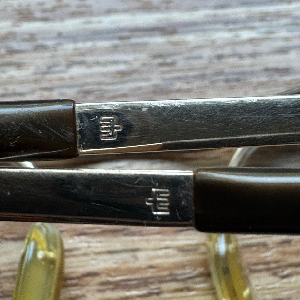 Vintage 70s Marwitz Optima Eyeglasses Gold Tone Brown Acetate Made in Germany bridge 22 mm, temple 140 mm I cannot make out the script engraved on left temple piece (see photo 12) prescription lenses intact, scratches on the metal and on the temple tips, expect wear throughout glasses need adjusting