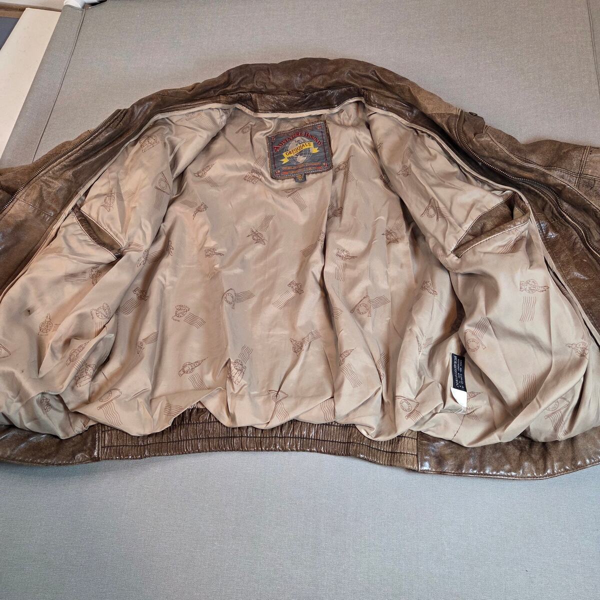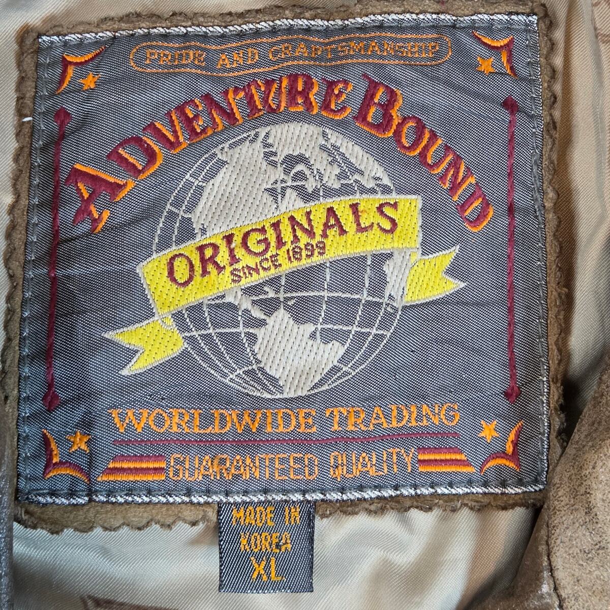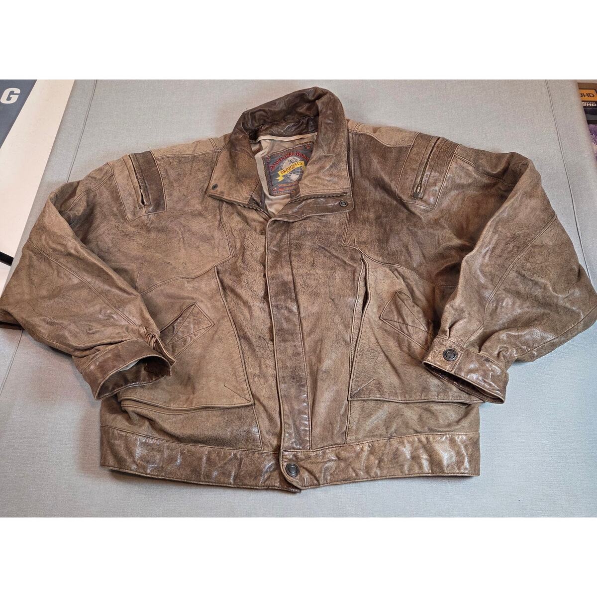 Vintage 1980s Adventure Bound Originals brown leather bomber jacket. Classic cropped, boxy fit with wide arms and ribbed waistband, fully lined with nylon and polyester fill. Made in Korea, style 4075. Heavy genuine leather with authentic patina and a few small surface marks shown in photos. Great piece of retro outerwear style. Size XL (25.5"L 26" pit-to-pit 27" sleeve approx.) 100% genuine leather shell ? nylon/polyester lining Made in Korea ? Style 4075 ? Code 69426 Ribbed waist cuffs ? zip front ? dual pockets Good vintage condition with minor marks