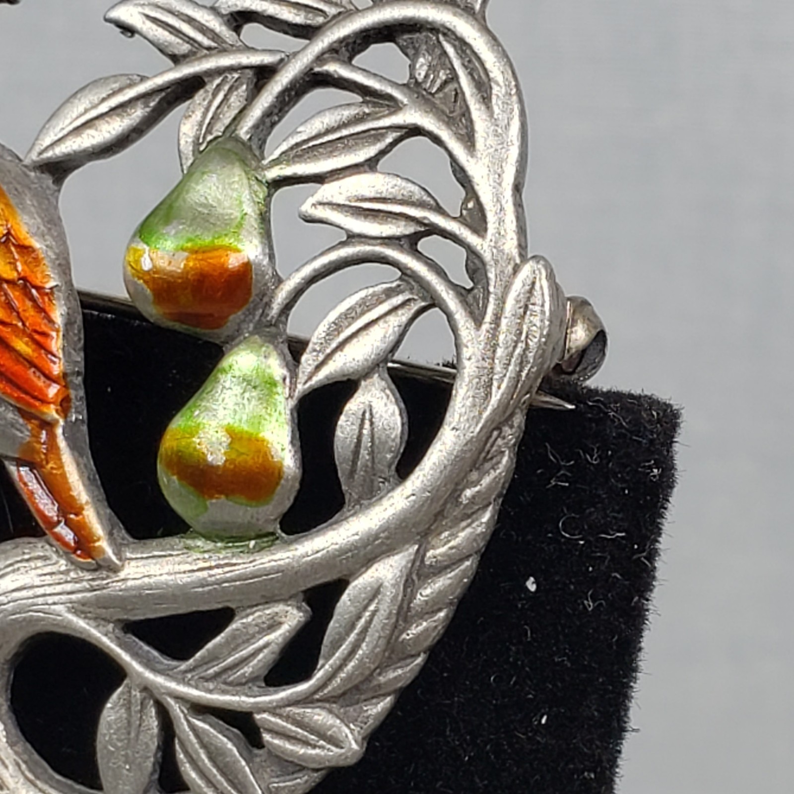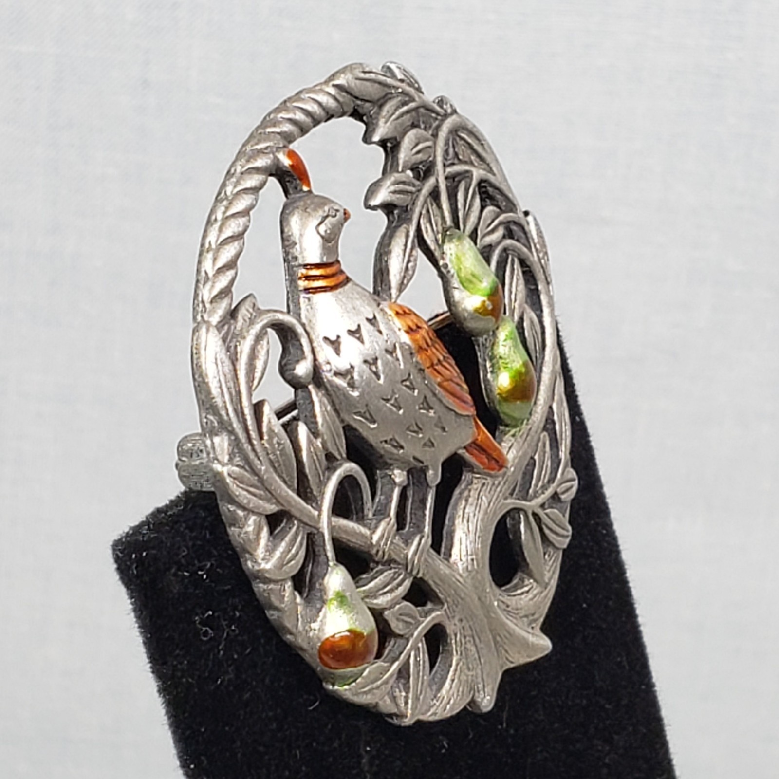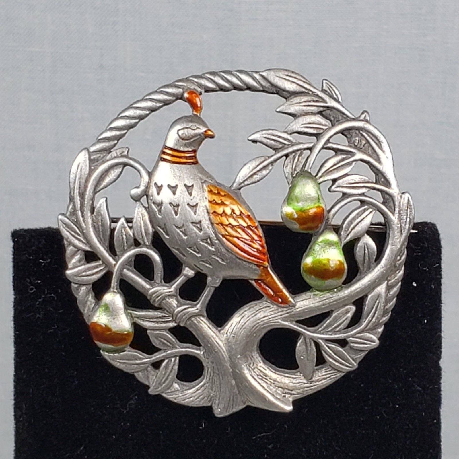 Vintage 1986 "JJ" Jonette Jewelry Enamel Pewter Partridge in a Pear Tree X-mas Silver Tone Brooch