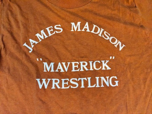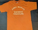 En vente est un VTG des annees 1990 d'occasion James Madison Maverick Wrestling Crewneck T-shirt 50/50 Orange USA en taille Medium.