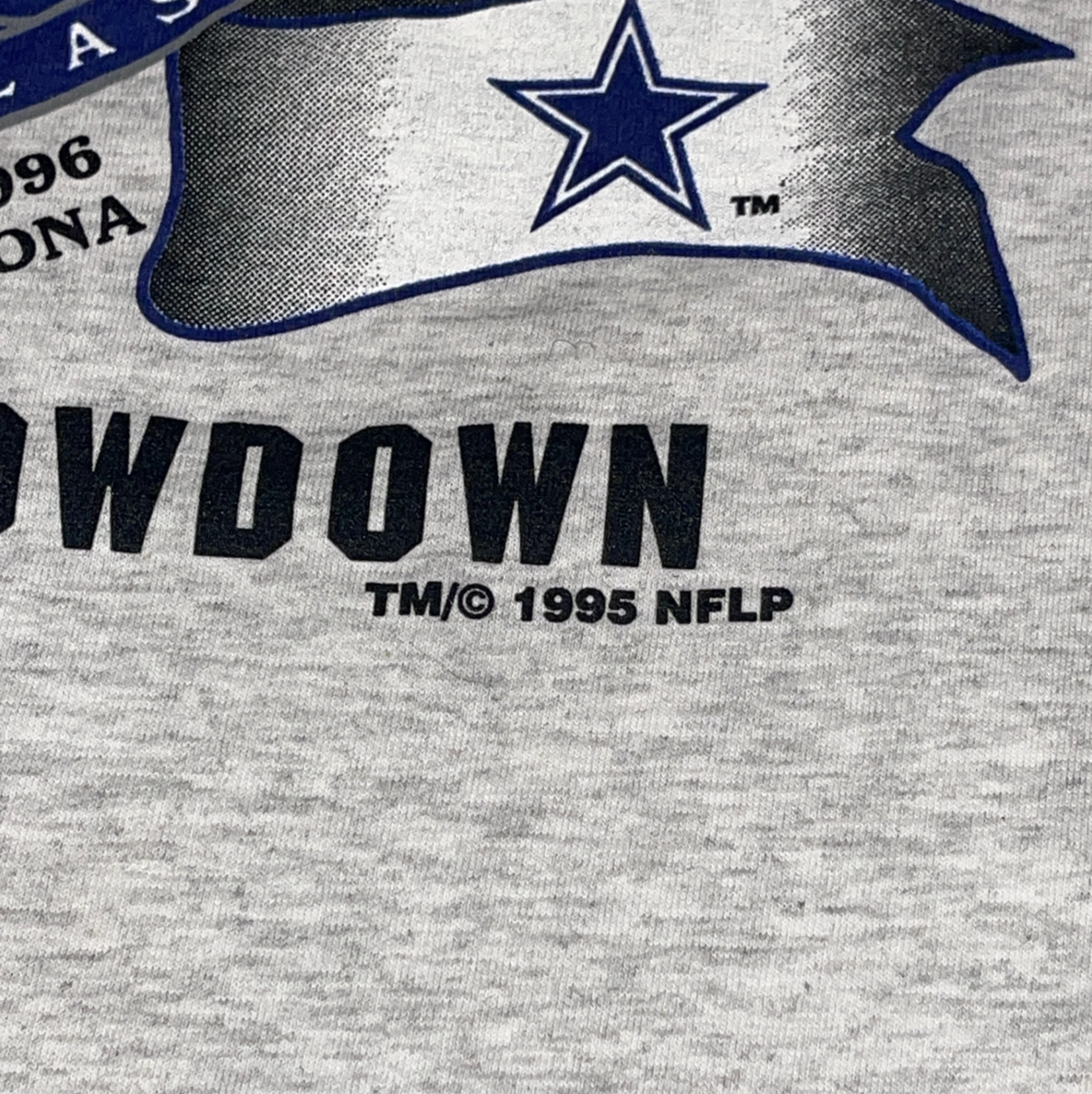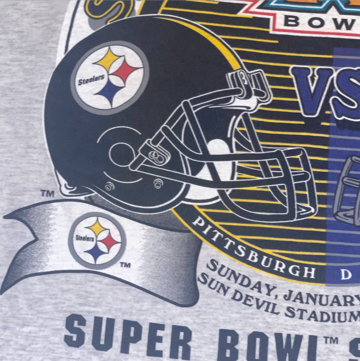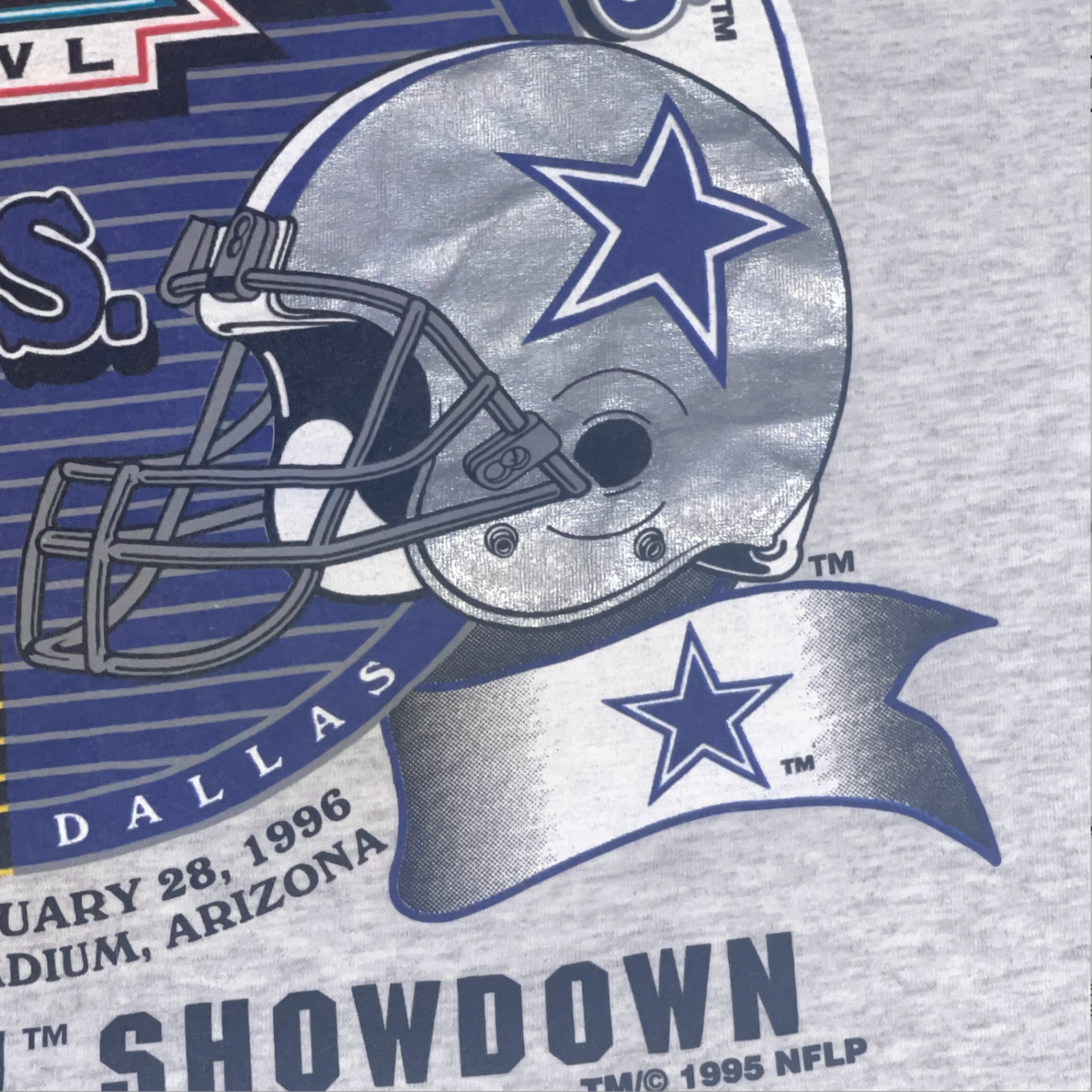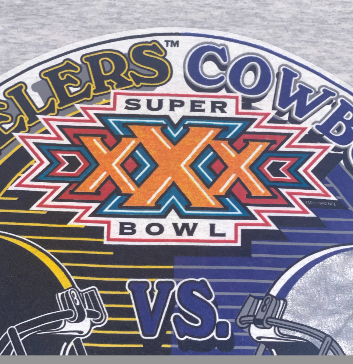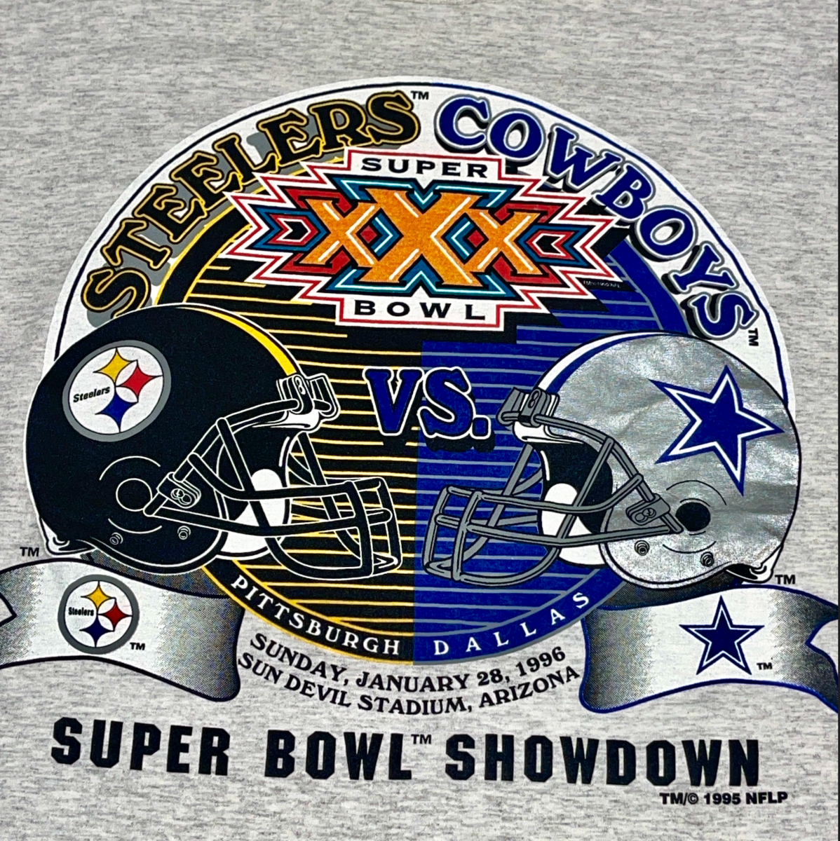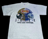 Vintage 1996 Super Bowl XXX Steelers vs Cowboys Duel in the Desert XL T-Shirt This was a new deadstock shirt with a few condition issues. There's sticker residue on front from where the holographic sticker was. The back has a few very very light marks and one tiny pine hole. Still a solid vintage shirt. Bright bold graphics. Stamped 1995 NFLP on front. Heather gray with foil graphics. Size tag XL extra large on Logo 7, Inc tag. Measures 24 inches across the chest and 29 inches overall length. Great collectors piece! Please see all gallery photos. We are a smoke free, pet friendly home. Have a great day! Thank you for supporting my small business!
