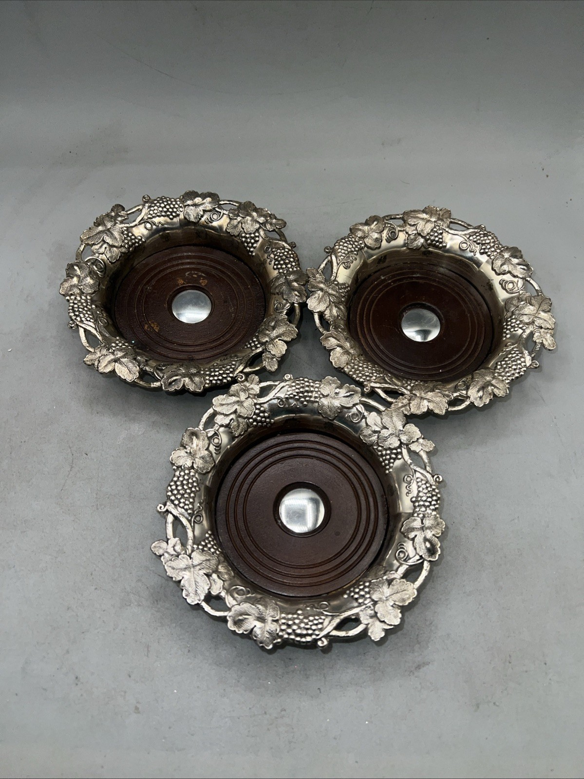 - Vintage 3 English Silverplate Mahogani Wine Bottle Coaster Holder Made In Japan