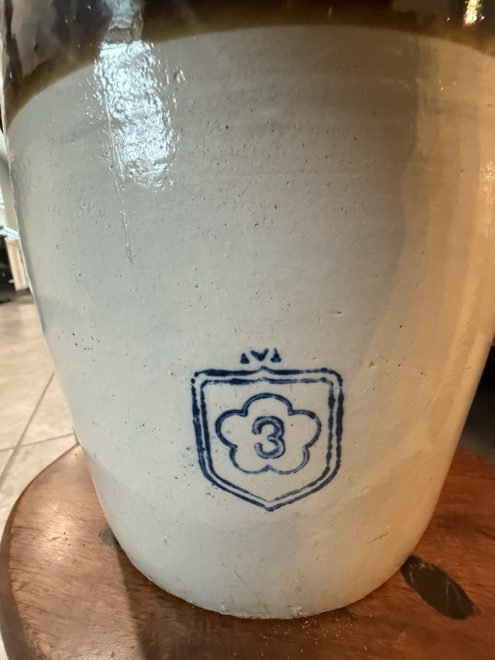 Step into a simpler time with this vintage 3-gallon stoneware butter churn, a charming relic of early American farm life. With its classic two-tone glaze?rich brown on top, warm beige below?and a stamped blue cloverleaf emblem bearing the number ?3,? this churn once served as an everyday essential in rural kitchens.