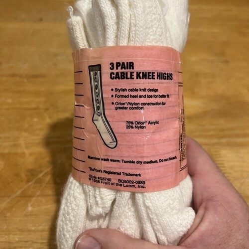 Add a vintage touch to your lingerie collection with these knee-high stockings from Fruit of the Loom. The blue color and secretary/geek look make them perfect for a casual occasion in the 1980s. Made of 75% acrylic and 25% nylon, they are comfortable to wear and easy to maintain. These original stockings are perfect for women of size 9-11 and come in a regular size type. Ideal for collectors and vintage enthusiasts, these stockings are a great addition to any vintage clothing collection.