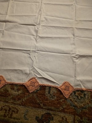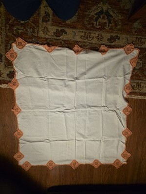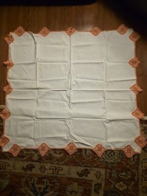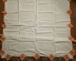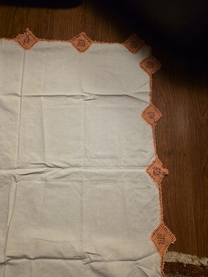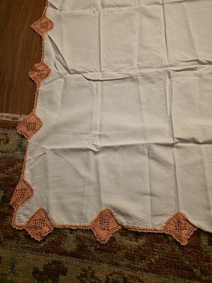 Vintage 36x33 White Tablecloth Coral Crochet Lace Edge Handmade Square Cottage