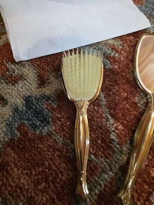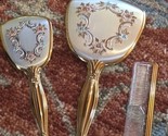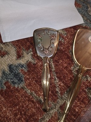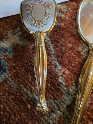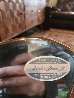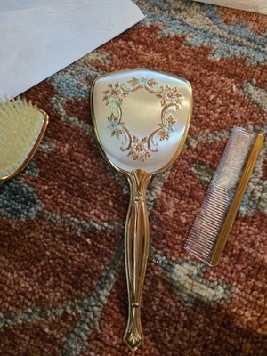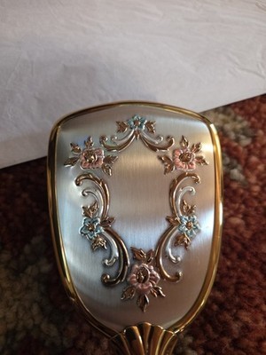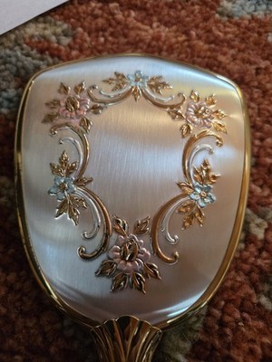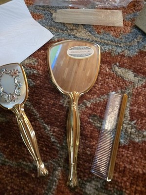 ? Vintage Astorloid Vanity Dresser Set ? Mirror, Brush Comb ? Mint, Never Used! ? An absolutely stunning Astorloid Vanity Dresser Set, preserved in brand new, never-used condition ? a truly rare find that bridges vintage beauty and timeless craftsmanship. This elegant 3-piece set includes a hand mirror, hairbrush, and comb, each featuring gleaming gold-tone metal handles with intricate floral filigree in soft pink and blue enamel accents. The satin-finished backs shimmer with a pearlescent sheen, catching the light beautifully. The design evokes the romantic charm of the mid-century vanity era, when luxury and detail were everything. What makes this piece extraordinary is its pristine, unused state ? it looks as though it?s been tucked away untouched for decades. Most Astorloid sets from the 1930s?1950s show age wear or tarnish, but this one has clearly been cherished and carefully stored. Finding a complete Astorloid set in mint condition is exceptionally rare ? especially with all three pieces intact and matching perfectly. These sets were originally made in the United States during a time when vanity pieces were not just functional but true works of art. ? Highlights: Authentic Astorloid dresser set ? circa 1940s?1950s Includes mirror, brush, and comb ? all matching Never used / new old stock condition Gorgeous gold-tone handles and floral enamel design Perfect for collectors, display, or as a one-of-a-kind gift A showpiece for any vintage vanity, Hollywood regency decor, or antique collection ? this Astorloid set captures the glamour and grace of a bygone era. ? A genuine vintage treasure ? exceptionally rare in this condition.
