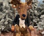 The seated deer has had a motor replacement at some point, but still has a good portion of his torso intact, a couple of antlers have been broken off and repaired as shown. The antlers were also repainted after that. Below his neck there is some wear as shown. Finally the original animated base that rocked his chair is not available, only the chair with deer as shown. Some stains to his shirt. No other major issues we can see.
