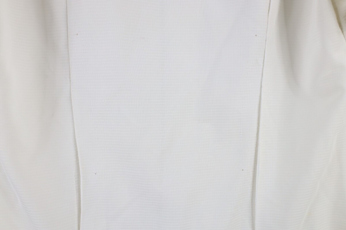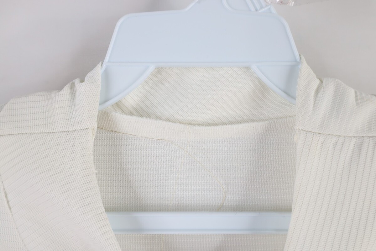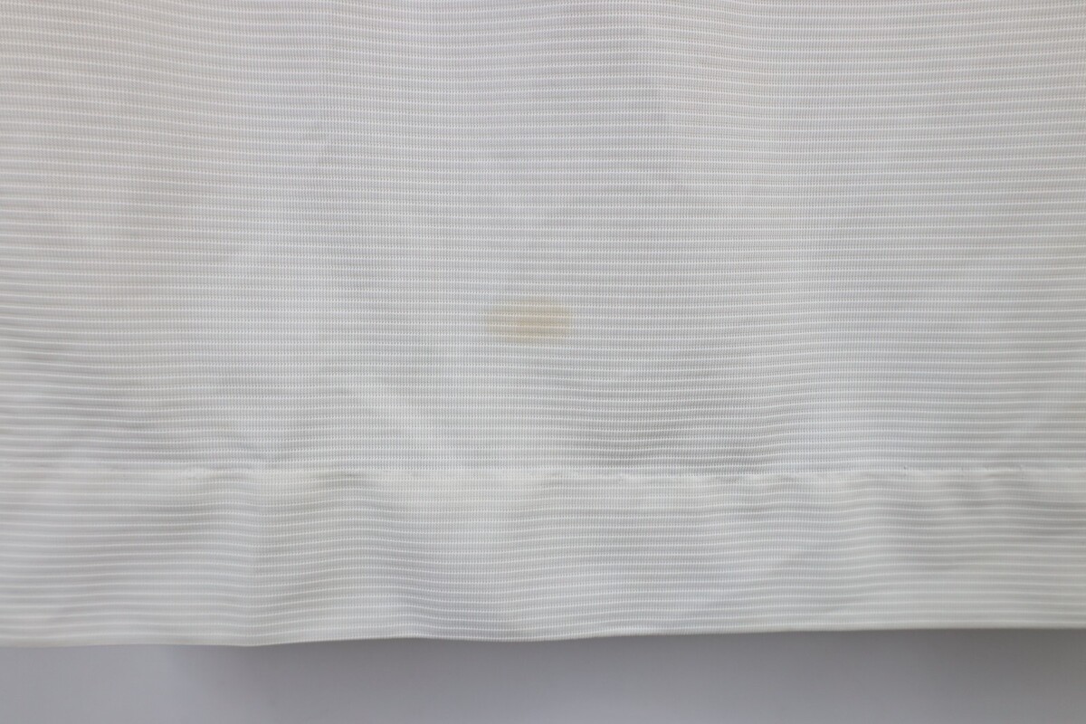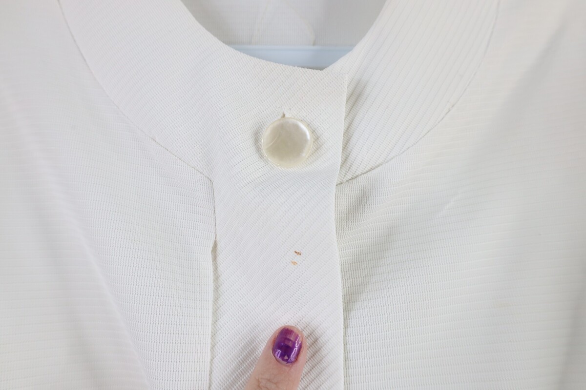 Stains front top and bottom. Holes middle back. Loose seams inner collar. Has stains on front. Top button held on with a safety pin. Somewhat see through. No size tag, check measurements