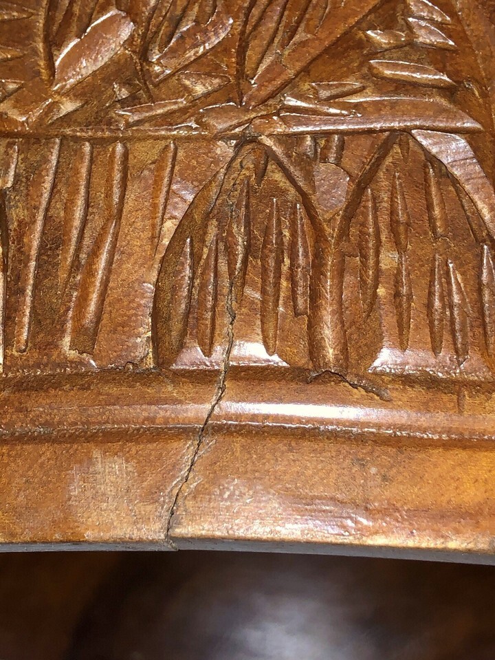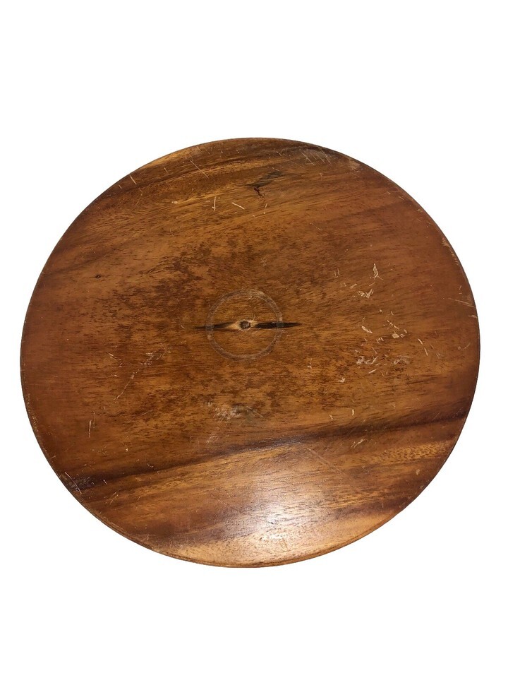 This vintage cake stand is perfect for those who love antique style and hand-carved details. The wooden stand comes with a dome lid and features a Hawaiian tiki boho design. The round shape and glossy finish make it a unique addition to any kitchen or dining table. Ideal for baking enthusiasts, this cake stand is great for presenting and packaging cakes. It is made of high-quality wood and is perfect for those who want to add a touch of vintage charm to their home. Whether for special occasions or everyday use, this cake stand is sure to impress. Approximate measurements 10? Tall 15? base diameter 10.5? where the cake would sit 12? top diameter * Does not sit flat. There is a crack on the lid. See photos as part of the description. Would be awesome display item.