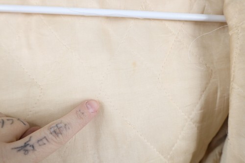 Blemishes on cuffs. Pilled. Blemishes in liner. USA made