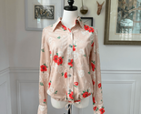 Vintage 70s Cue Trend New York blouson style button up shirt or blouse with drawstring waist. The drawstring waist gives it an amazing faux tuck look woyhout the bulk. light beige color with reddish orange poppies with green stems and white queen anns lace. The collar is slightly pointed, but not as extreme as a Barrymore collar. I have a separate listing for a pair of high waisted green 70s trousers that would look fantastic with this. No noted flaws. Laying flat measures 24 inches shoulder to hem and 20 inches armpit to armpit. Based on these measurements and how it fits on my size medium dress form in the photo I?m listing this as a medium, but I think it would also fit a large as well.