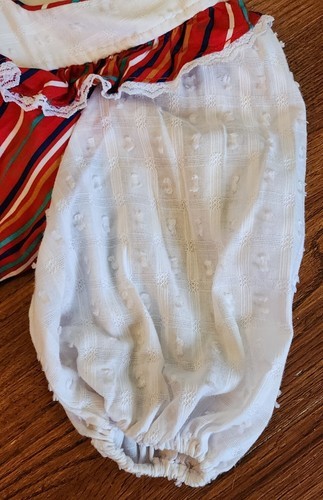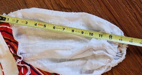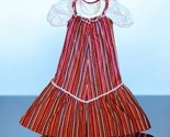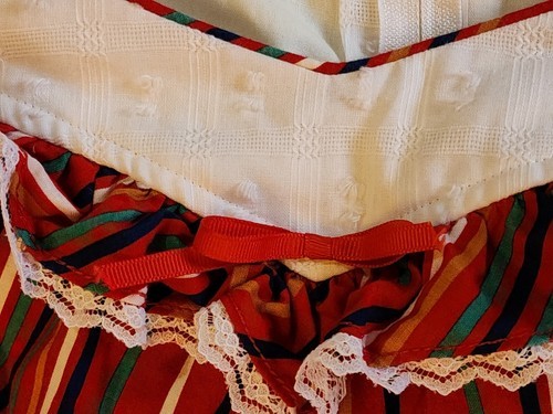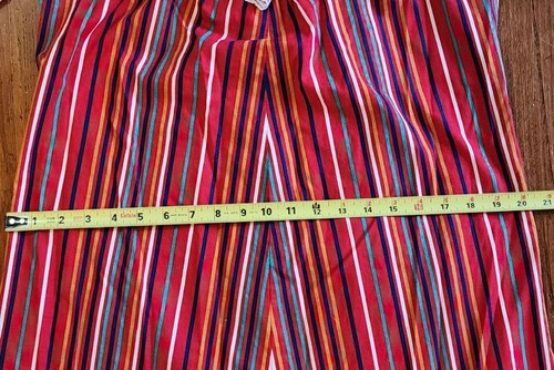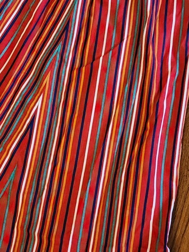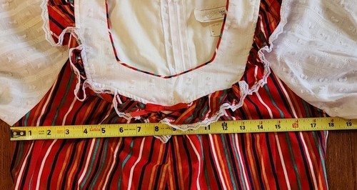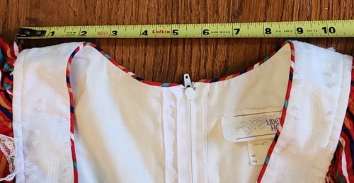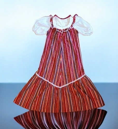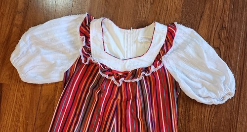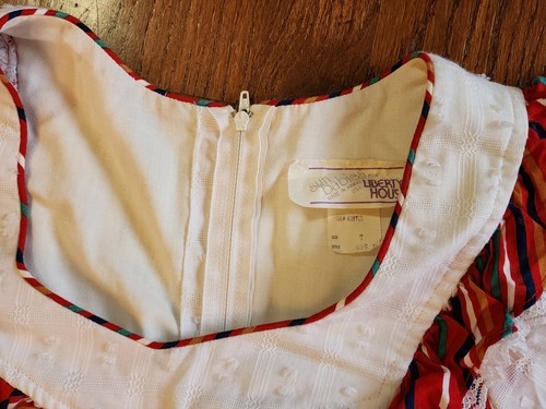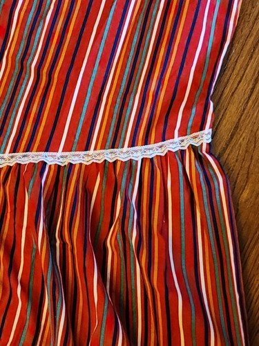 Vintage Maxi Fun Happy Red with Blue, Green, Orange, and White stripes seamed in the front asymmetrical for an eye catching design dress by Sun Babies For Liberty House. Made in HAWAII USA. Featuring a white lace trim on the ruffle hem, white textured neckline trim with matching piping around the semi-square neckline, a back zipper closure, short puffed sleeves, tiered hem and POCKET--yes there is one (1) pocket on the right side!
