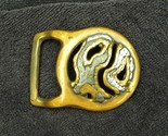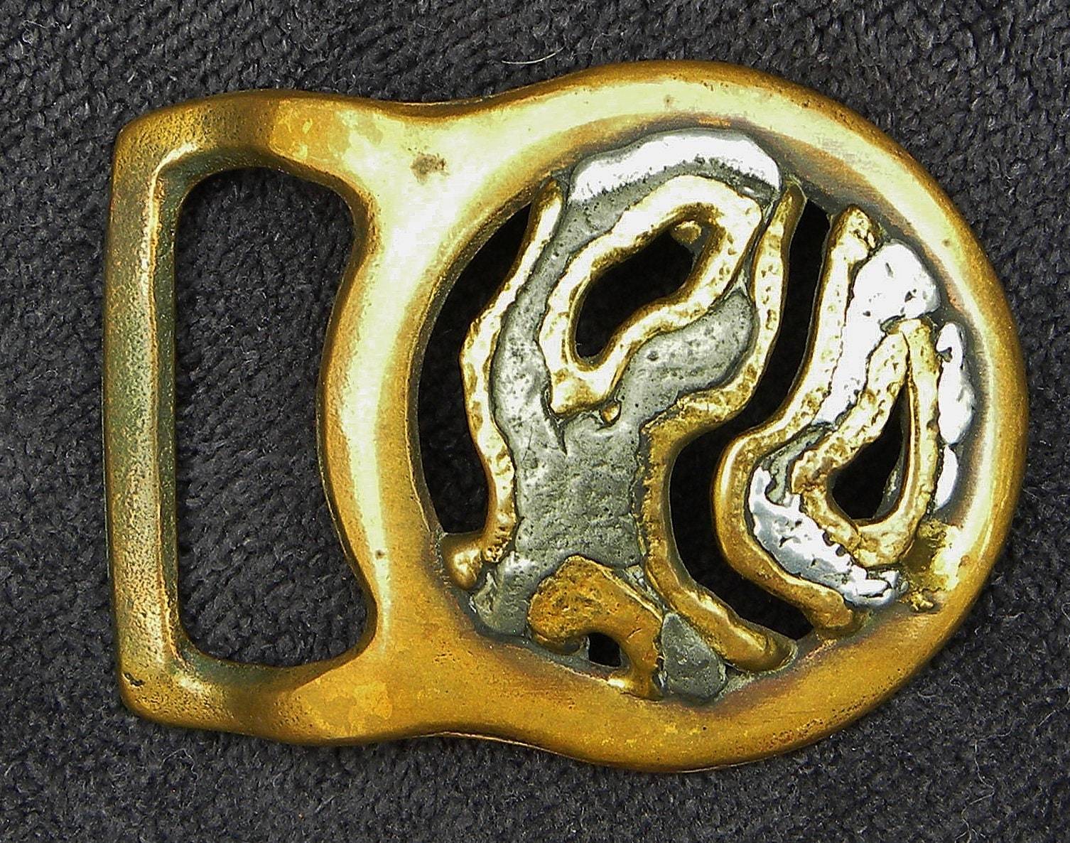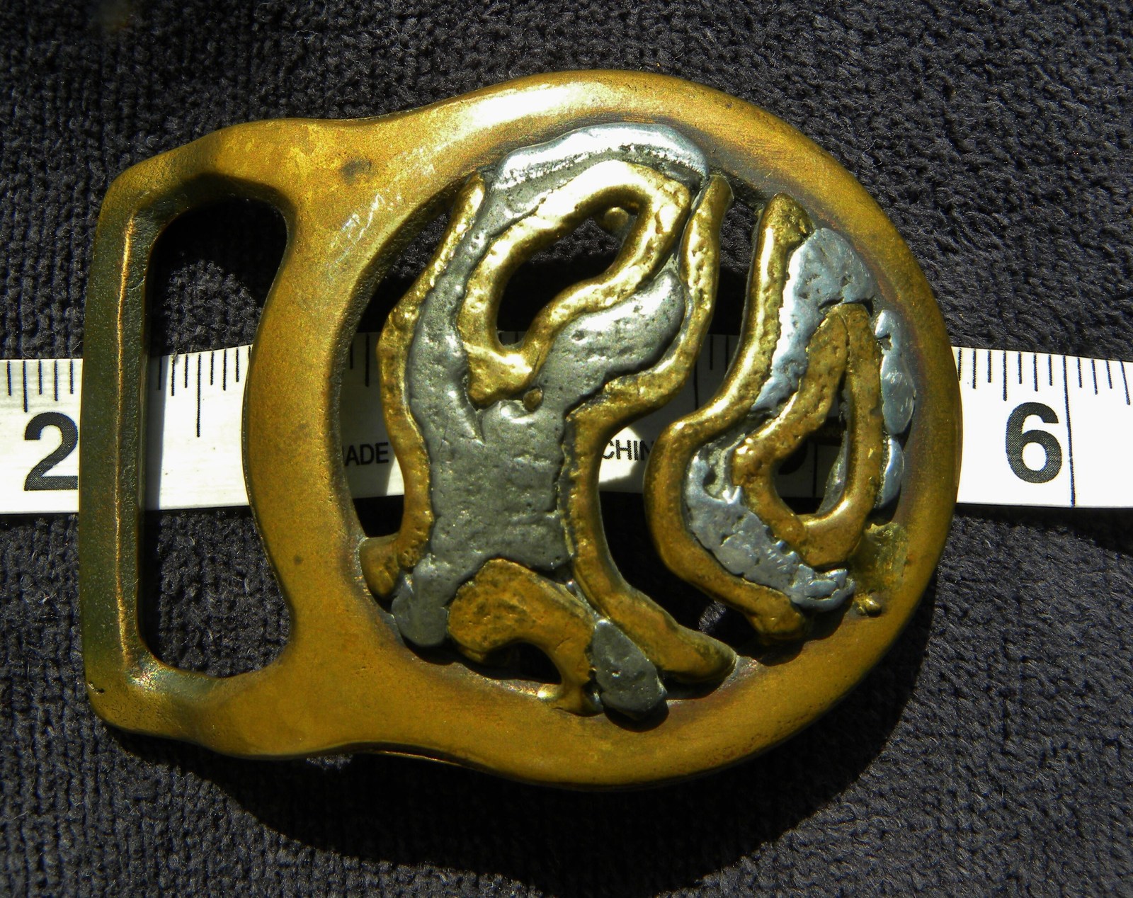 You are viewing a preowned Vintage USA 1970s solid brass belt BUCKLE from The Master Works. Each one was hand fashioned and this one looks like an abstract cowboy boot. Circular buckle Size: 3.5" Wide X 2.5 Tall. Will fit up to a 1 5/8" wide belt. POST Hole. Condition: This buckle shows wear consistent with average use and age, but beautifully seasoned.. Thanks for looking.