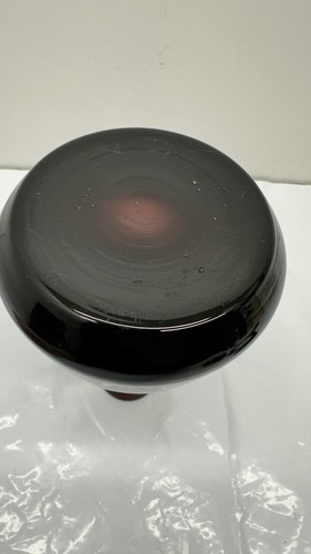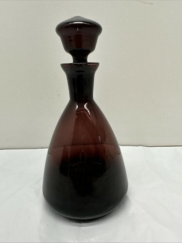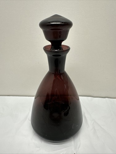 This vintage 8" amethyst purple glass decanter with stopper is a stunning piece of mid-century modern decor. The art glass bottle features a beautiful color and a sleek, all-over design that adds a touch of elegance to any space. The decanter is unmarked and has a vintage appeal, making it a unique and eye-catching addition to any collection or display. Perfect for those who appreciate mid-century style and decorative glassware.