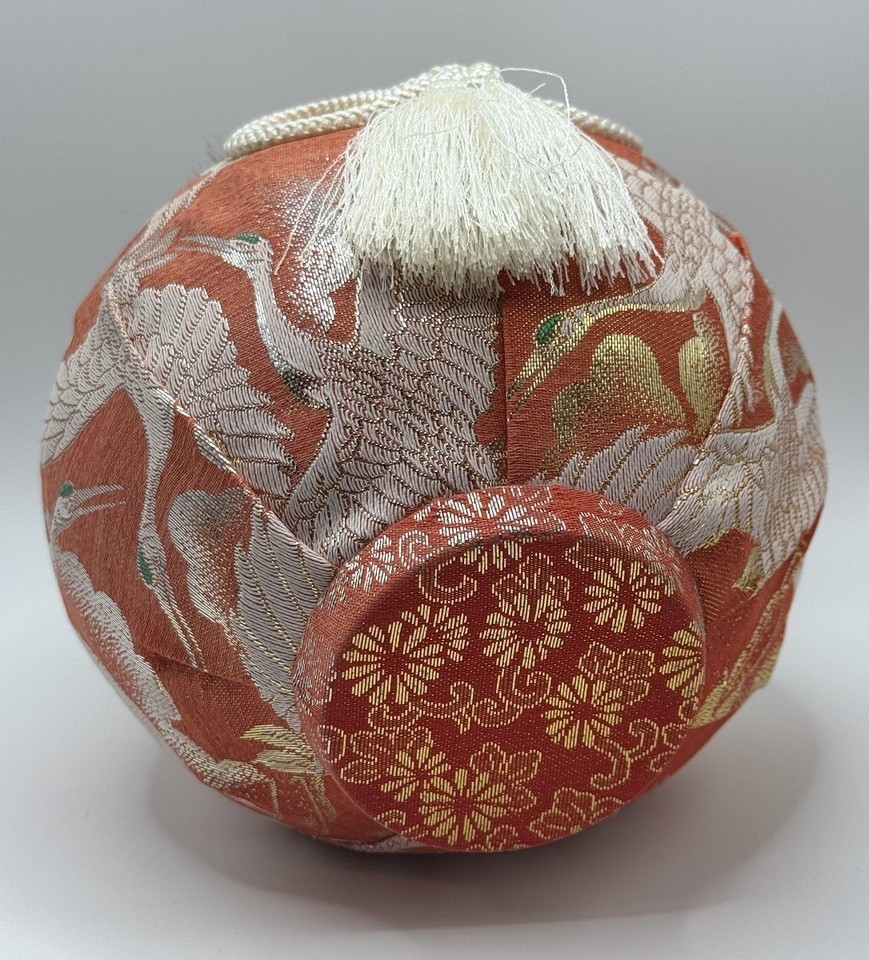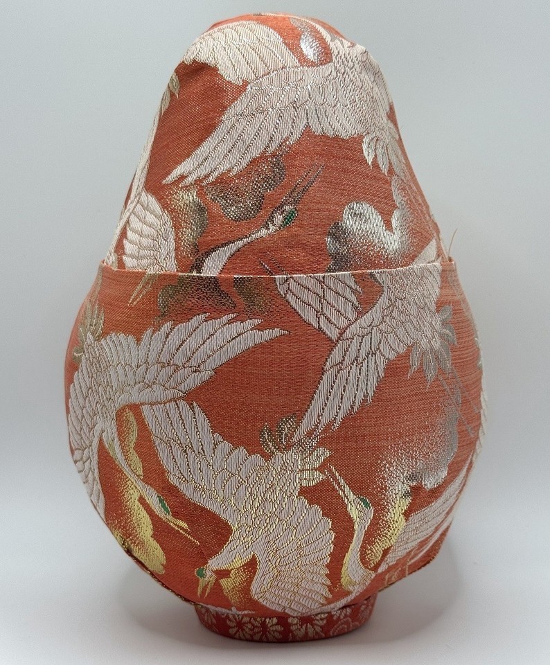 The body is wrapped in rich orange brocade fabric and adorned with a decorative cord and tassel.