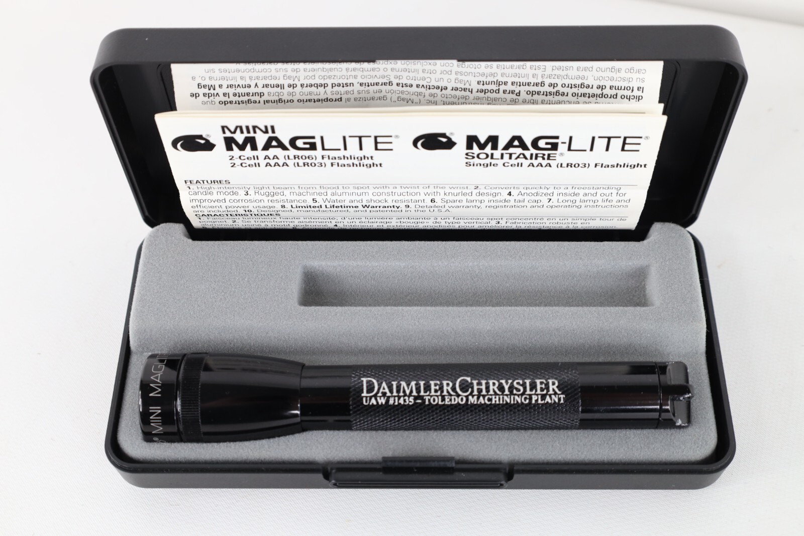 - Vintage 90s Maglite Mini UAW Daimler Chrysler Toledo Machining Flashlight w Case