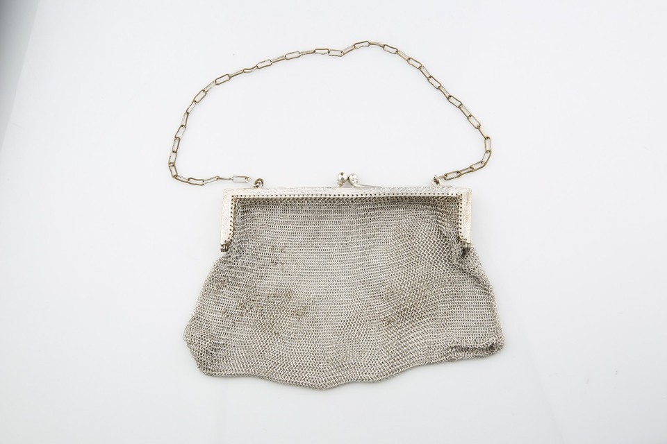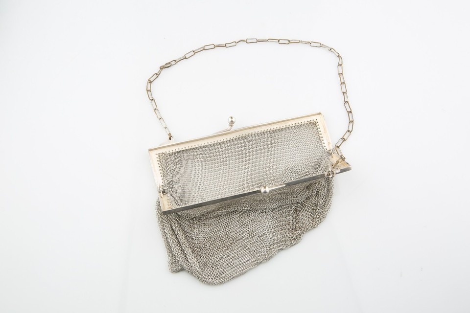 Cuenta con el cierre de plata grabado (con diseño floral) con malla plateada/bolsa de correo tejida