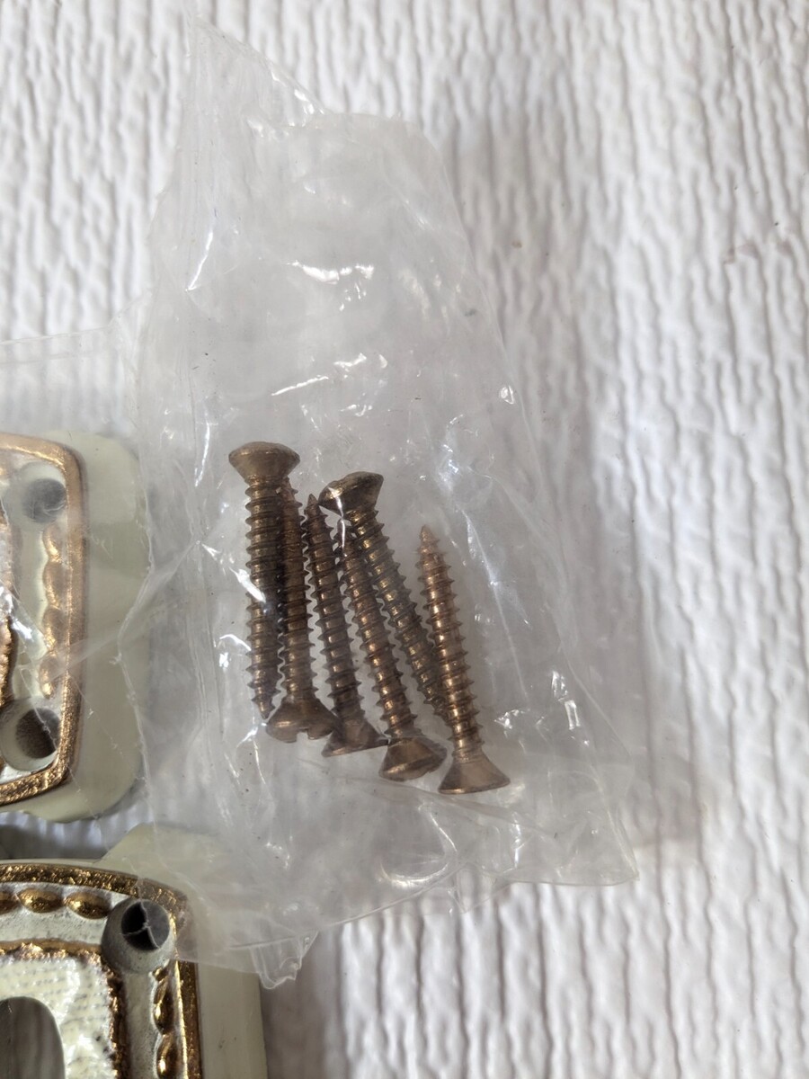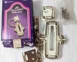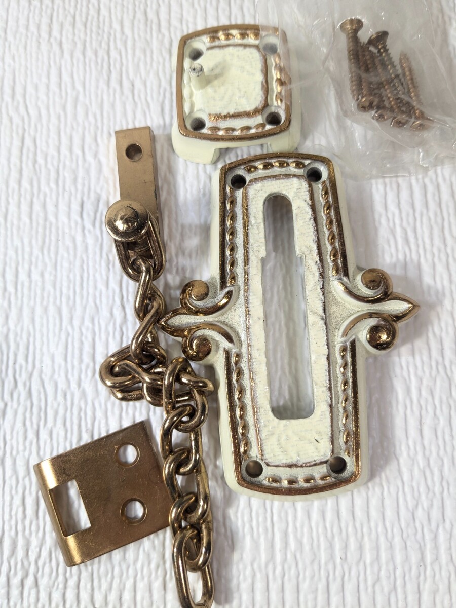 Vintage Amerock Bonaventure door chain security guard Regency White gold ivory Model C-8865RW. Missing a few screws(I think missing 2) but otherwise I believe all parts are included. Box condition as shown. Never mounted/used. Great for carriage house style.