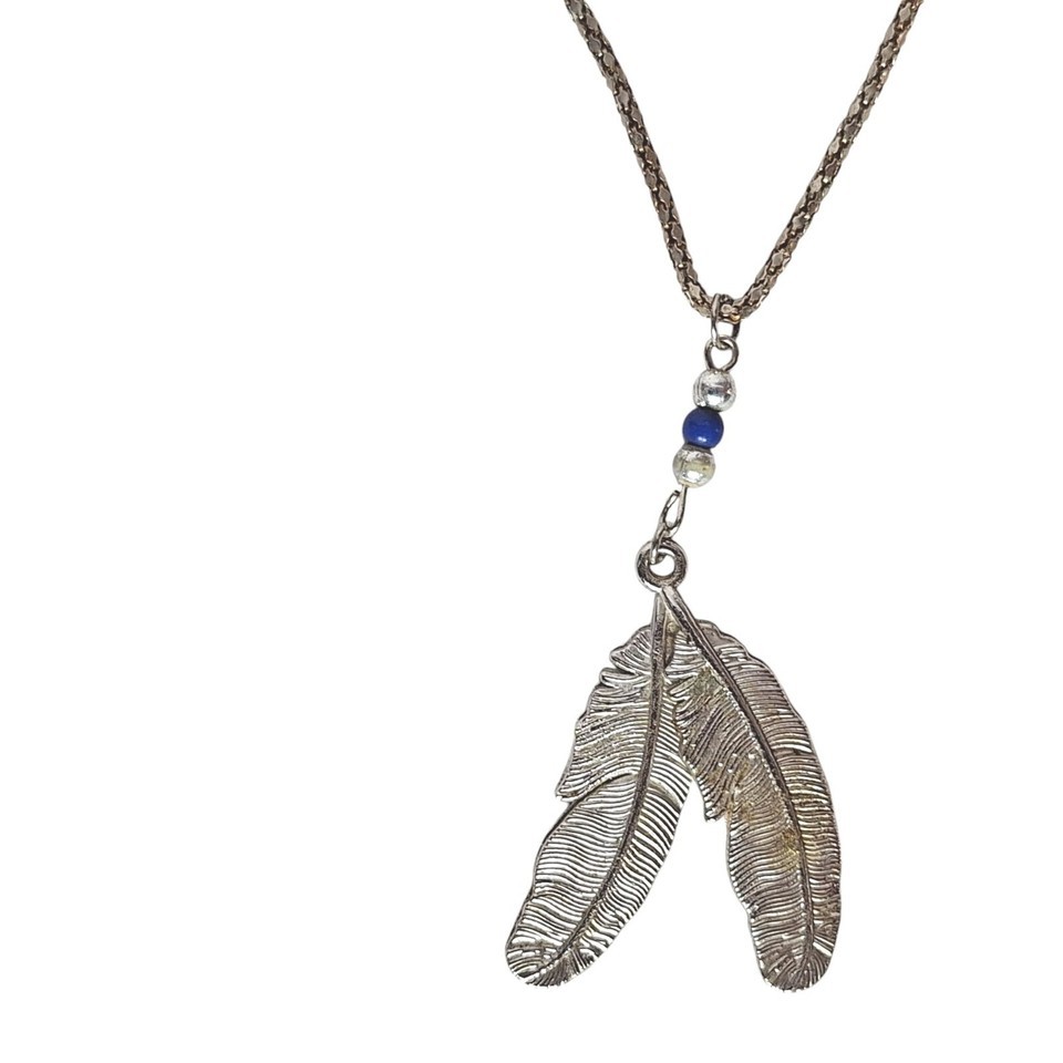 Vintage Art Deco Silver Tone Two Feather Pendant Drop Dangle Indian Necklace