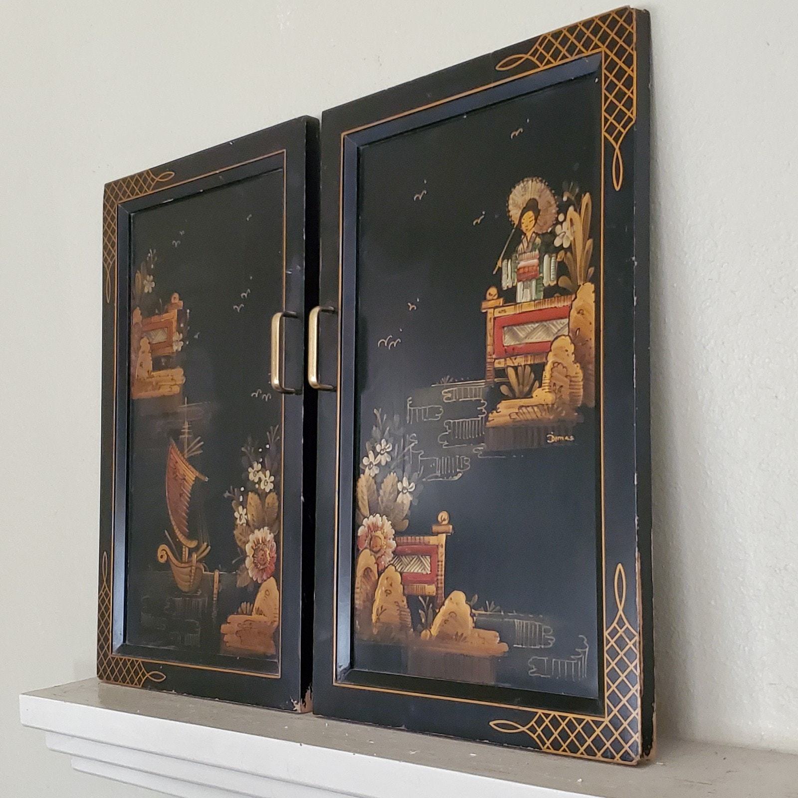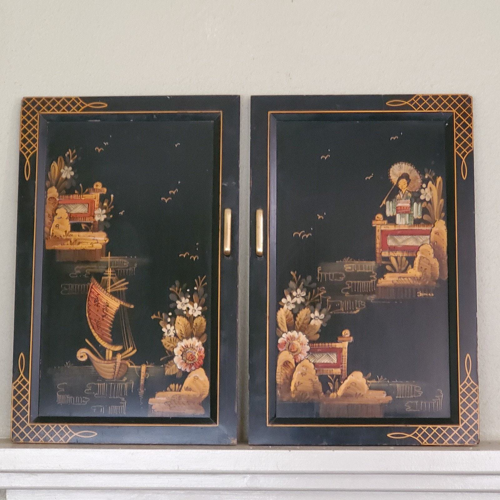 - Vintage Asian Hand Painted ART by Dimas 2 Cabinet Doors w/ Pulls 23x14.5" Each