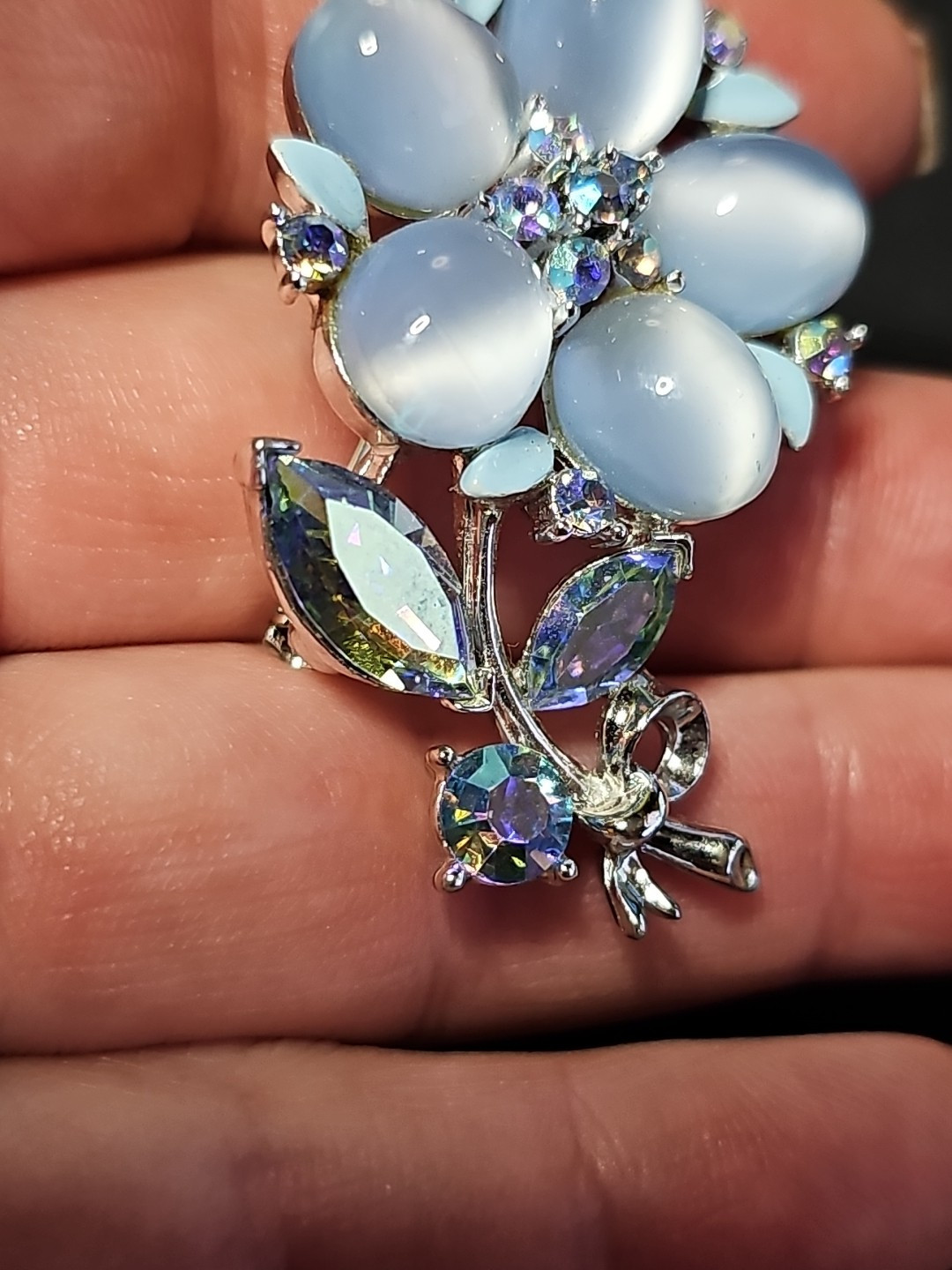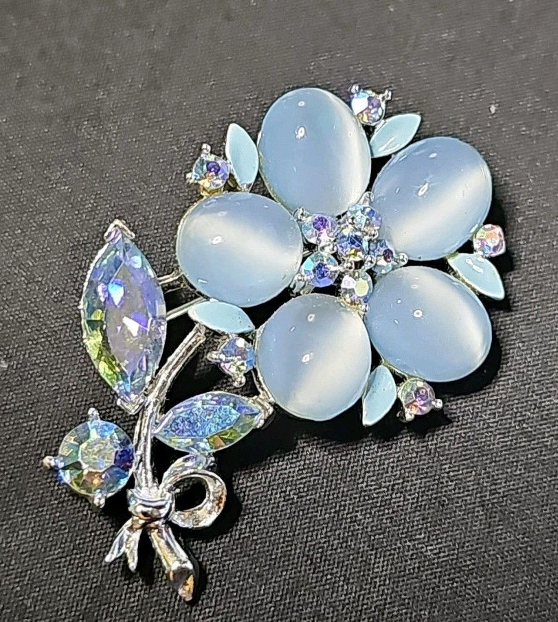This vintage floral brooch, stamped "Austria" on the back, features blue moonstone glass cabochons, sparkling aurora borealis rhinestones, and light blue enamel leaves, all set in a high-shine silver-tone metal. Austrian jewelry is well known for its exceptional craftsmanship and high-quality rhinestones, making this piece a beautiful addition to any collection.