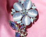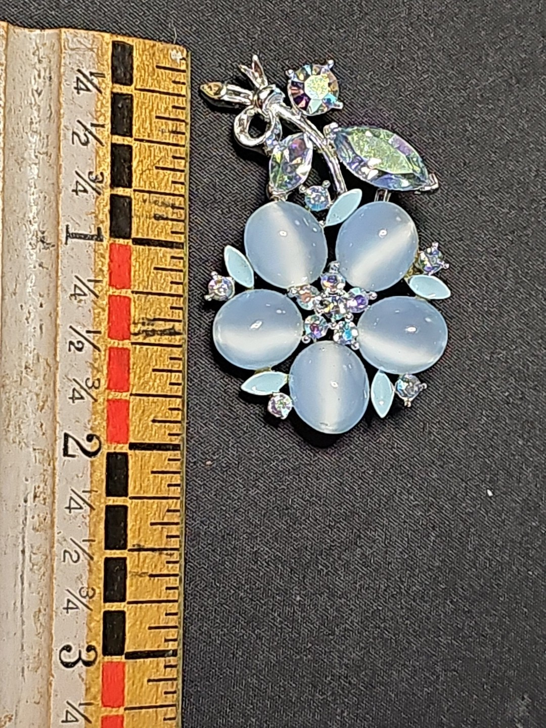 Vintage Austria Blue Moonstone Glass Cabochon Floral Brooch AB Rhinestones