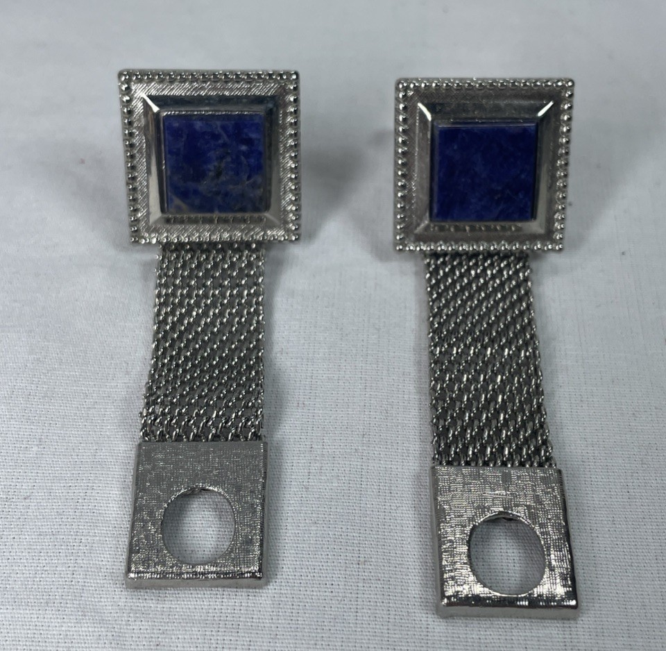 These Vintage BLUE SODALITE Silver Wrap-Around Square Cufflinks are a stylish addition to any man's wardrobe. The cufflinks feature a natural blue sodalite stone in a square shape, set in rhodium plated metal. The wrap-around design adds a unique touch to the classic square shape, making them stand out from traditional cufflinks. The bonus tie bar included with these cufflinks is also a practical and stylish accessory for completing a sharp-looking outfit. Perfect for those who appreciate vintage charm and quality craftsmanship. Pre-owned, very good condition, box NOT included