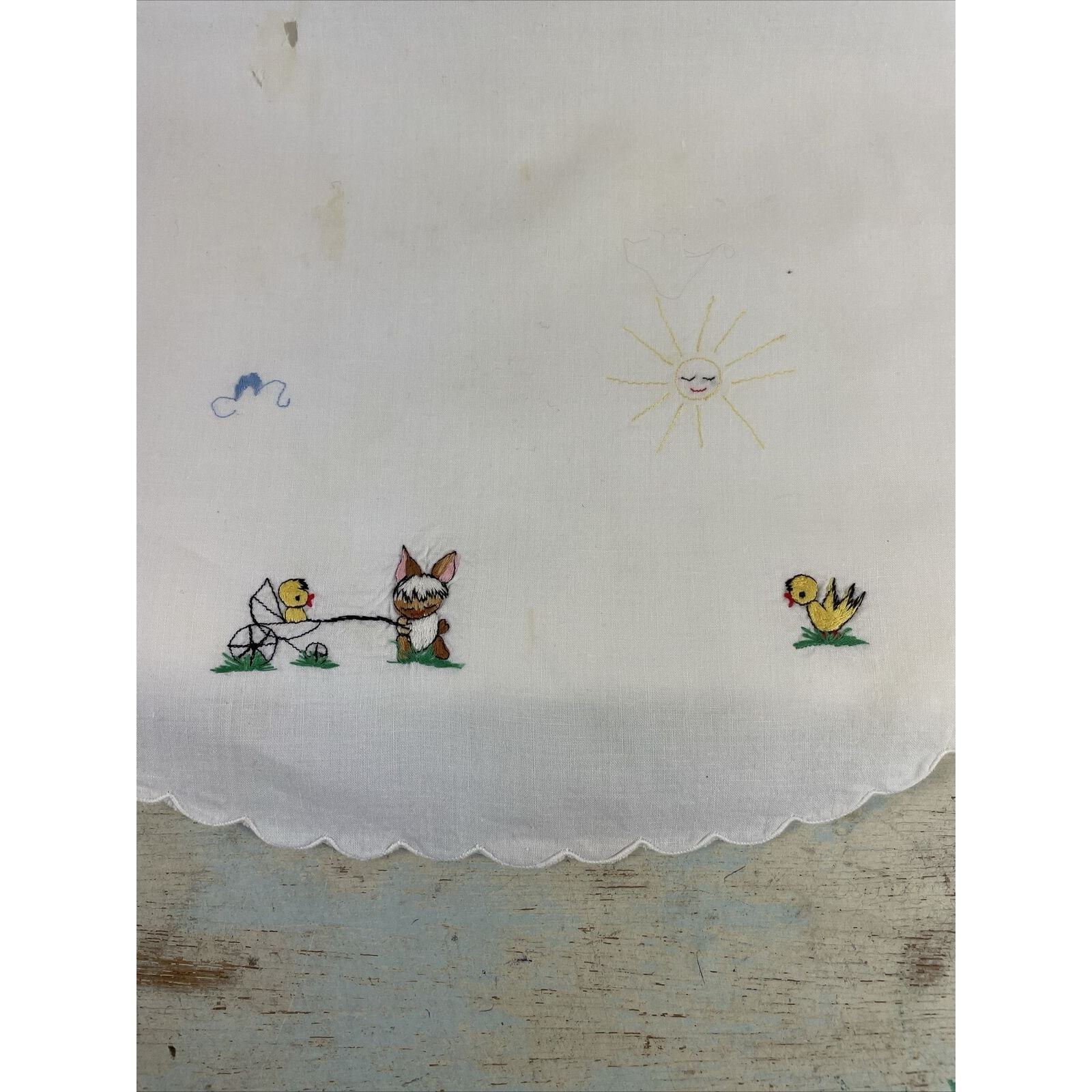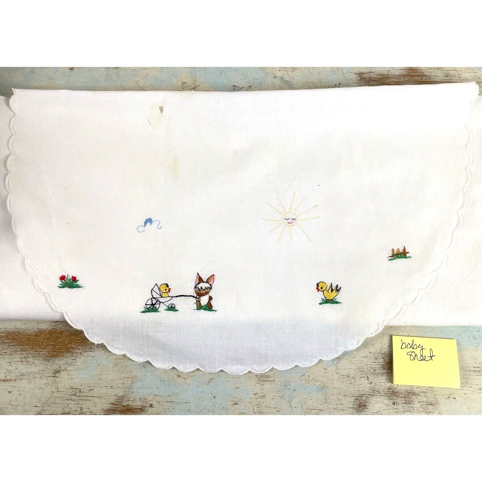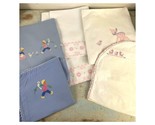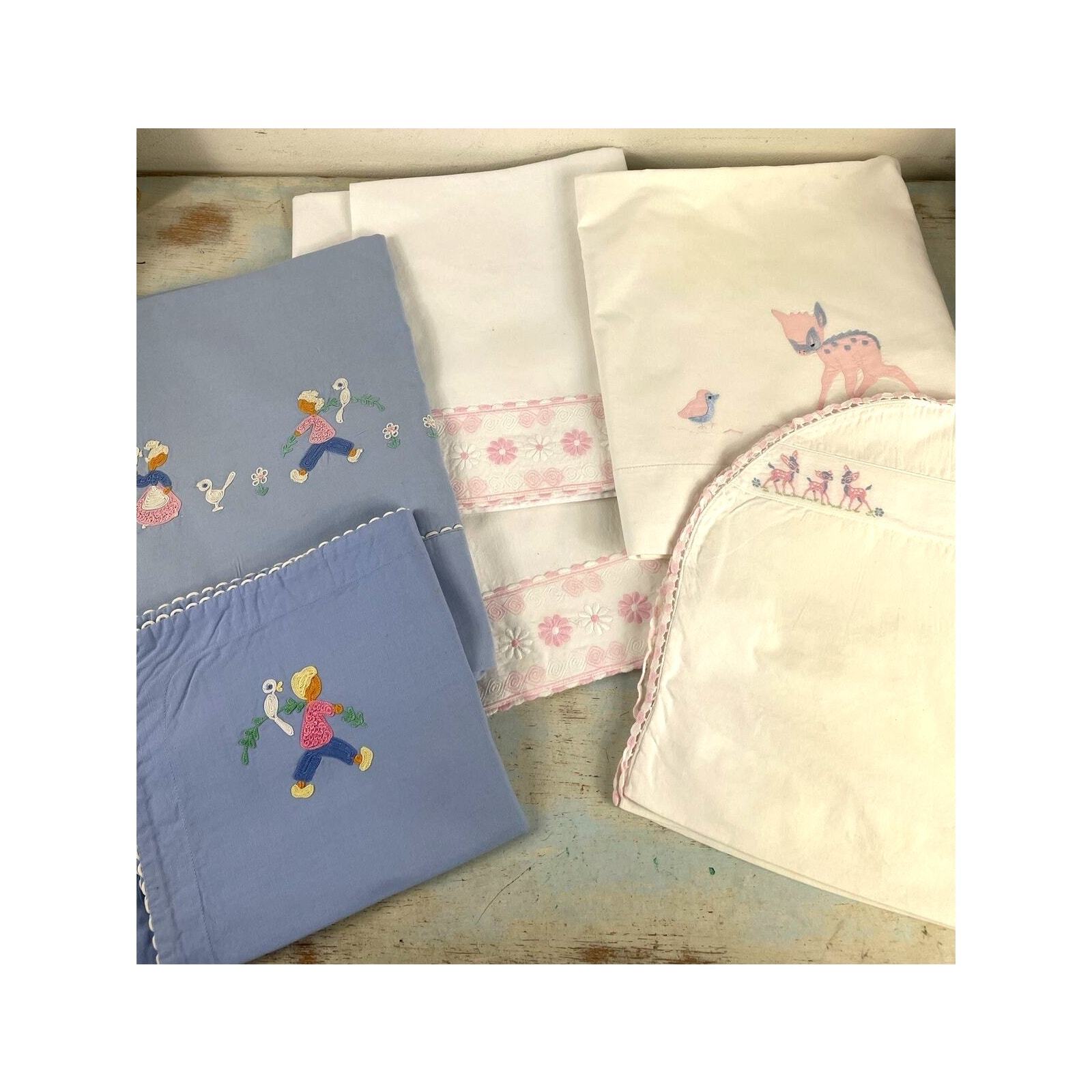 #1150 Vintage Baby Linens Lot 12 Embroidered Baby Sham, Highchair Covers, Sheets Pillowcases. Cutter Craft projects. 3 sets of matching sheet and pillow sham plus other applique and embroidered linens. There are holes in a couple. Please look at the pictures. Always consider offers.
