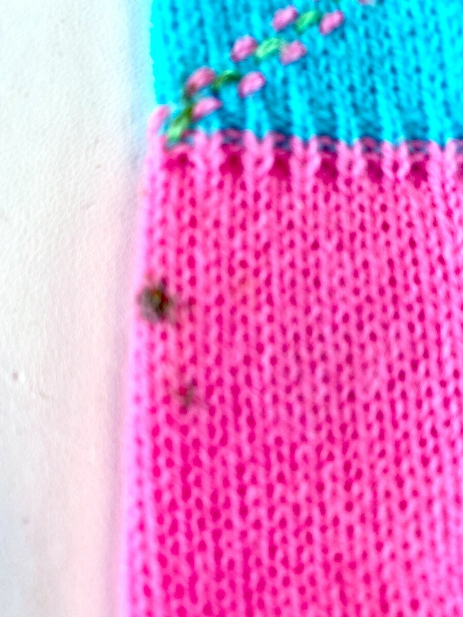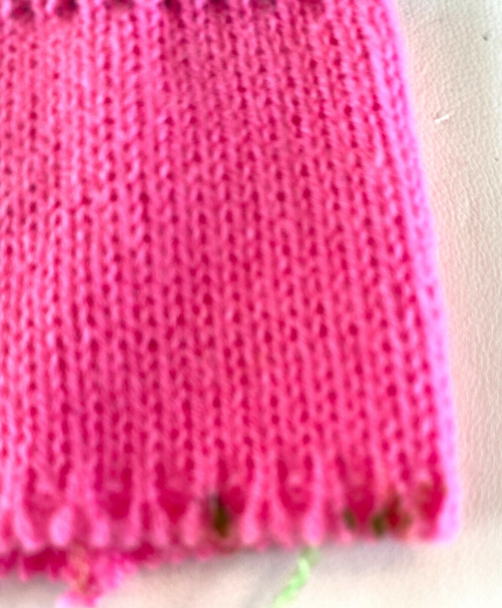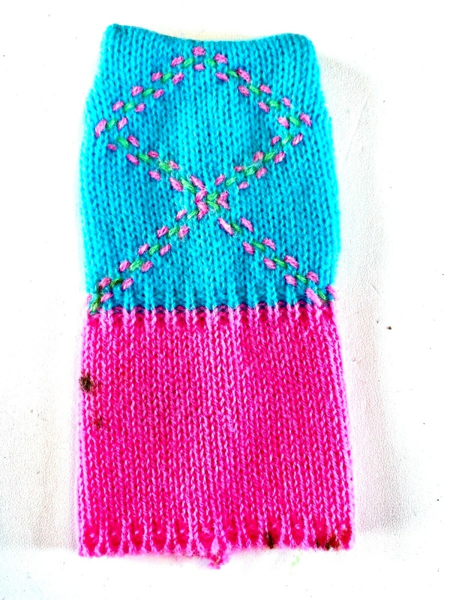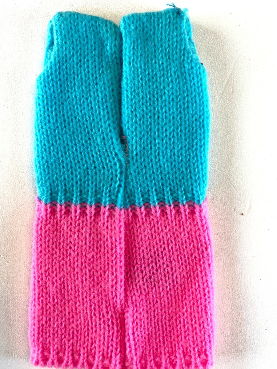 Vintage BARBIE Fashion #1804 KNIT HIT VGC Pink Blue Sheath Dress has a couple of stains and a frayed hem as shown