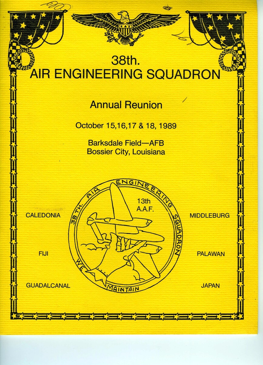 WWII 38th Air Engineering Squadron annual reunion. The reunion was held on October 15, 16, 17 18th, 1989. It measures 8 1/2" x 11" and features portraits of each attendee, a historical group photo, and candid shots. The book contains 16 pages. The book is in very good condition. There is no writing on any of the inside pages; however, there are two minor ink marks on the very top of the front cover. No rips or torn pages. In good condition. PayPal accepts Visa, Master Card and other CC.