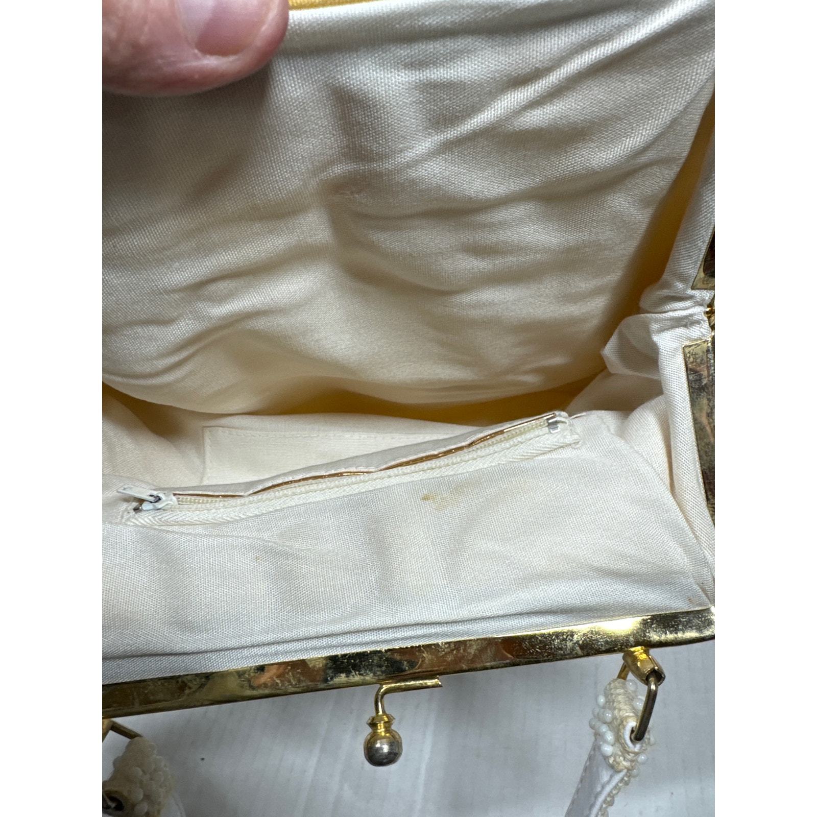 Vintage Beaded Handbag Satchel Purse White w/ Pink Roses Ball Clasp ClosureThis item has been cleaned pers used clothing policy.