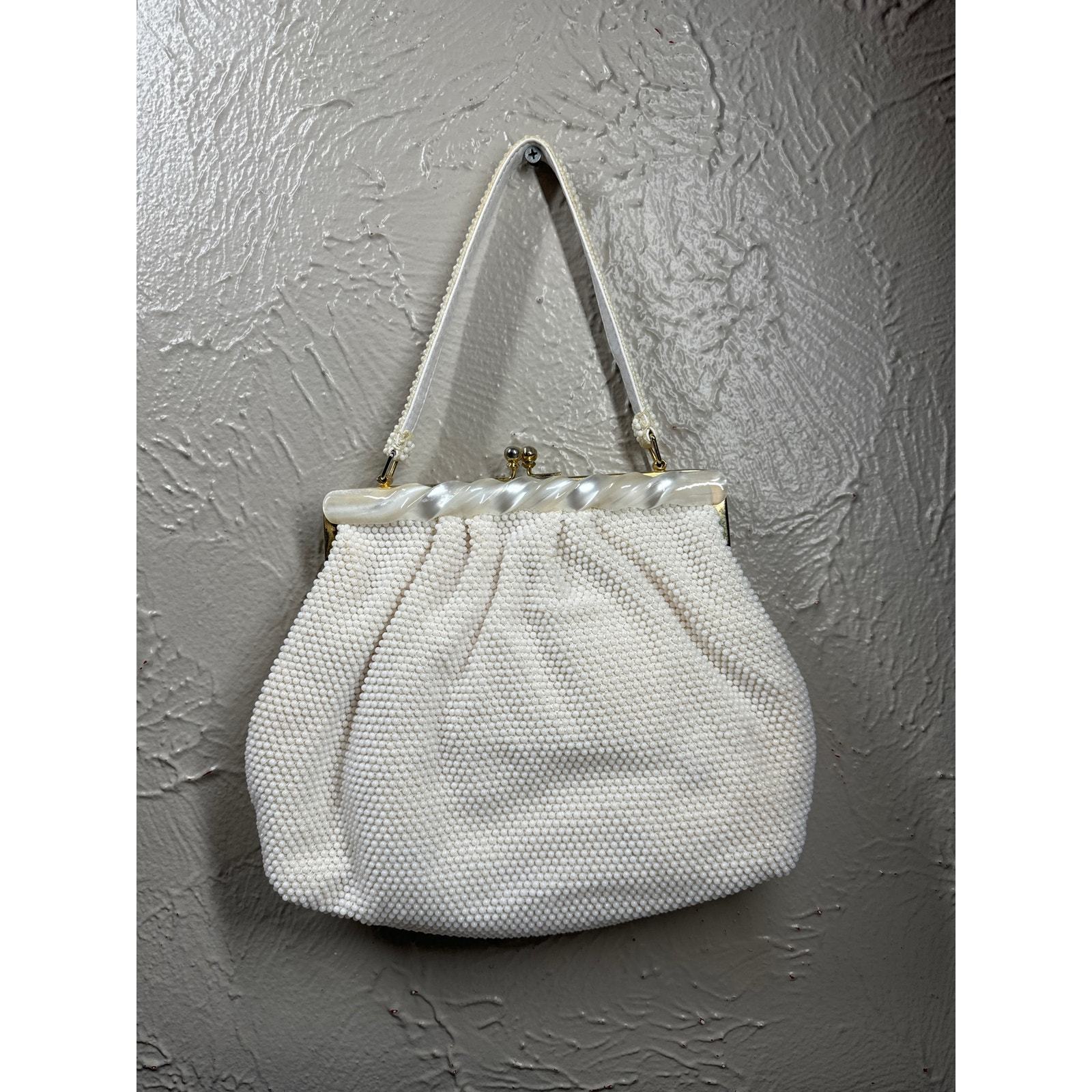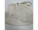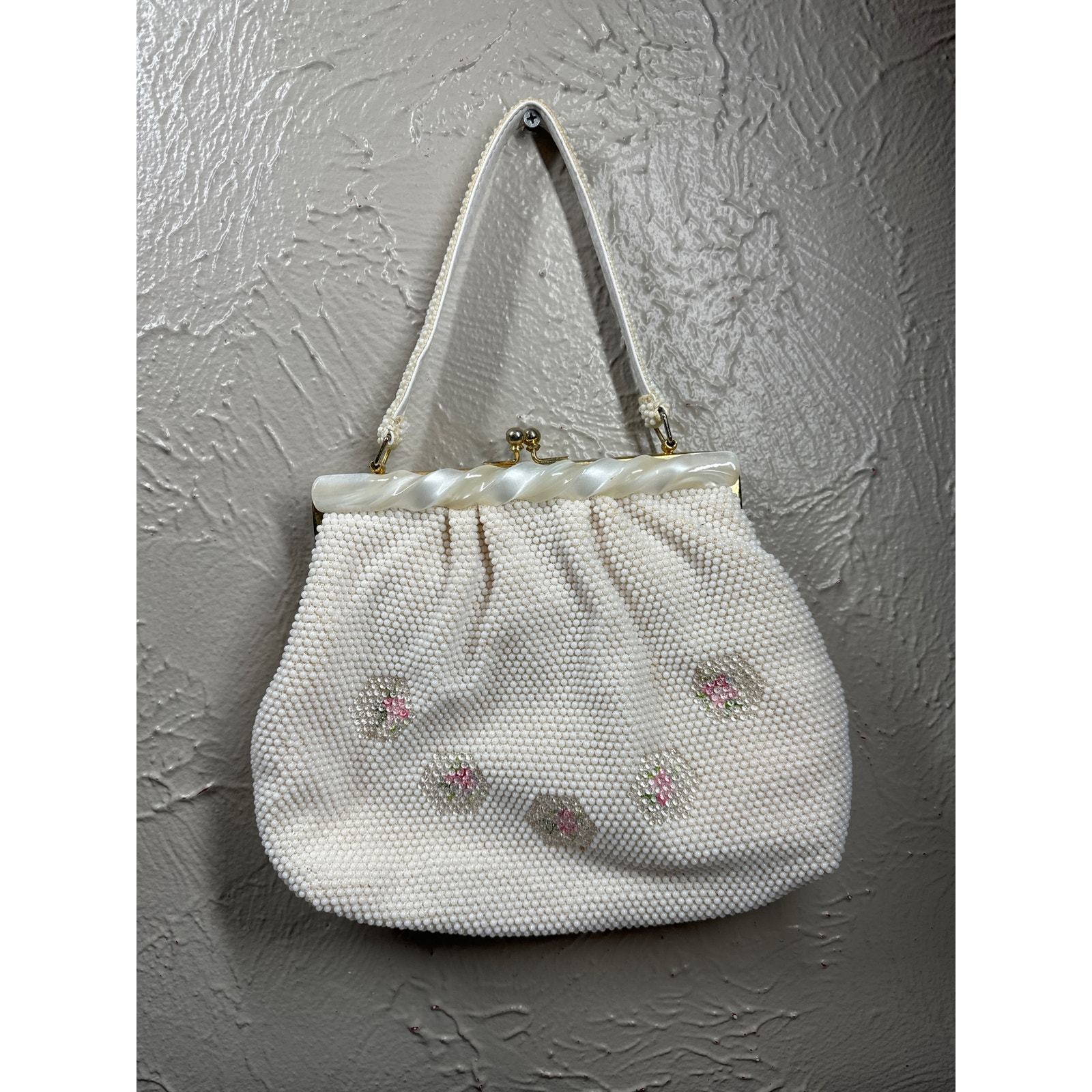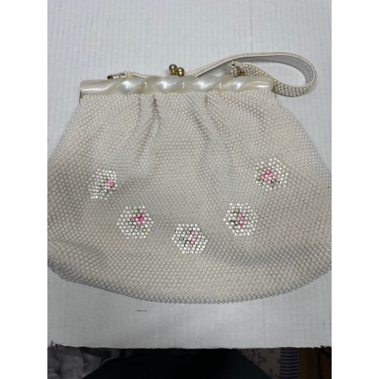 - Vintage Beaded Handbag Satchel Purse White w/ Pink Roses Ball Clasp Closure