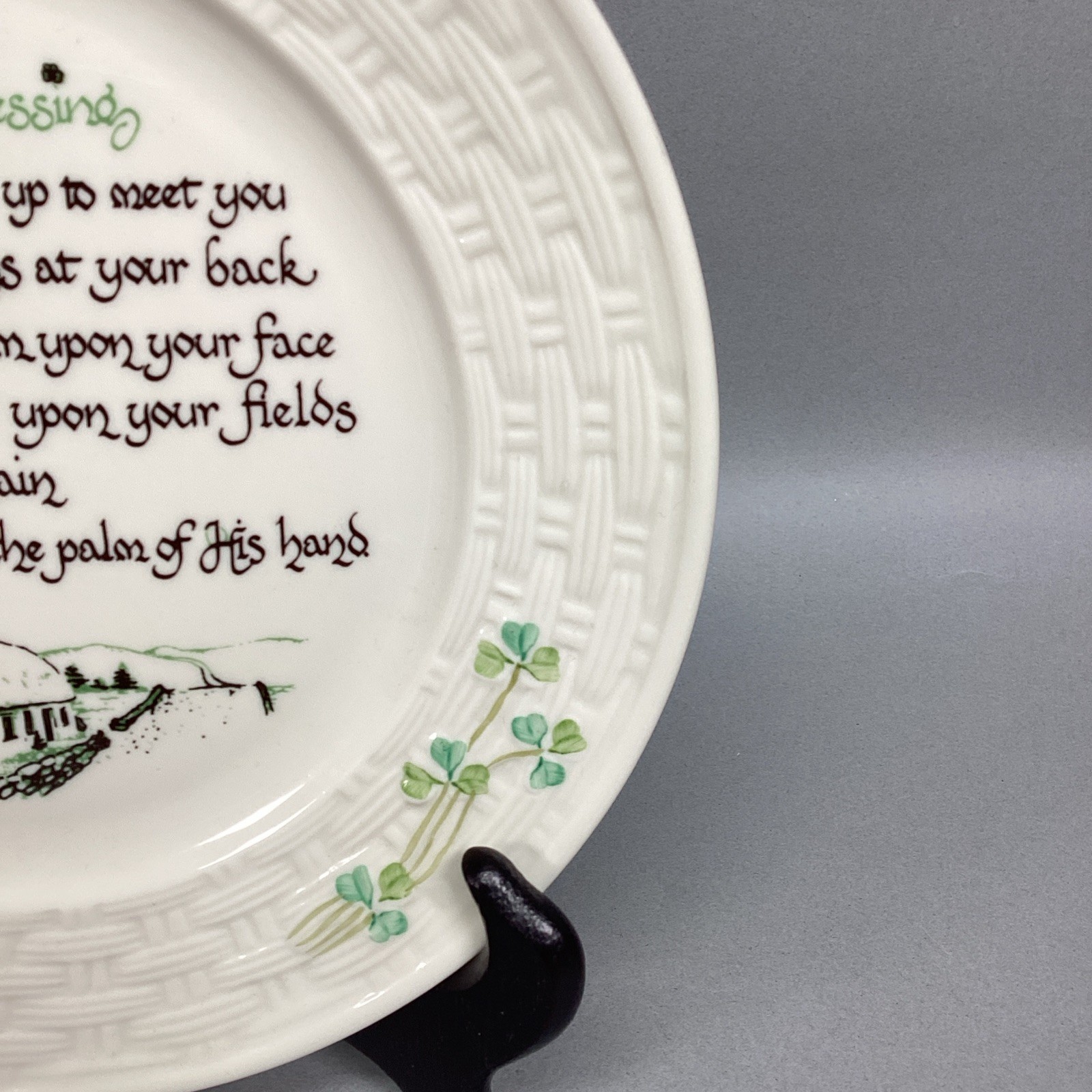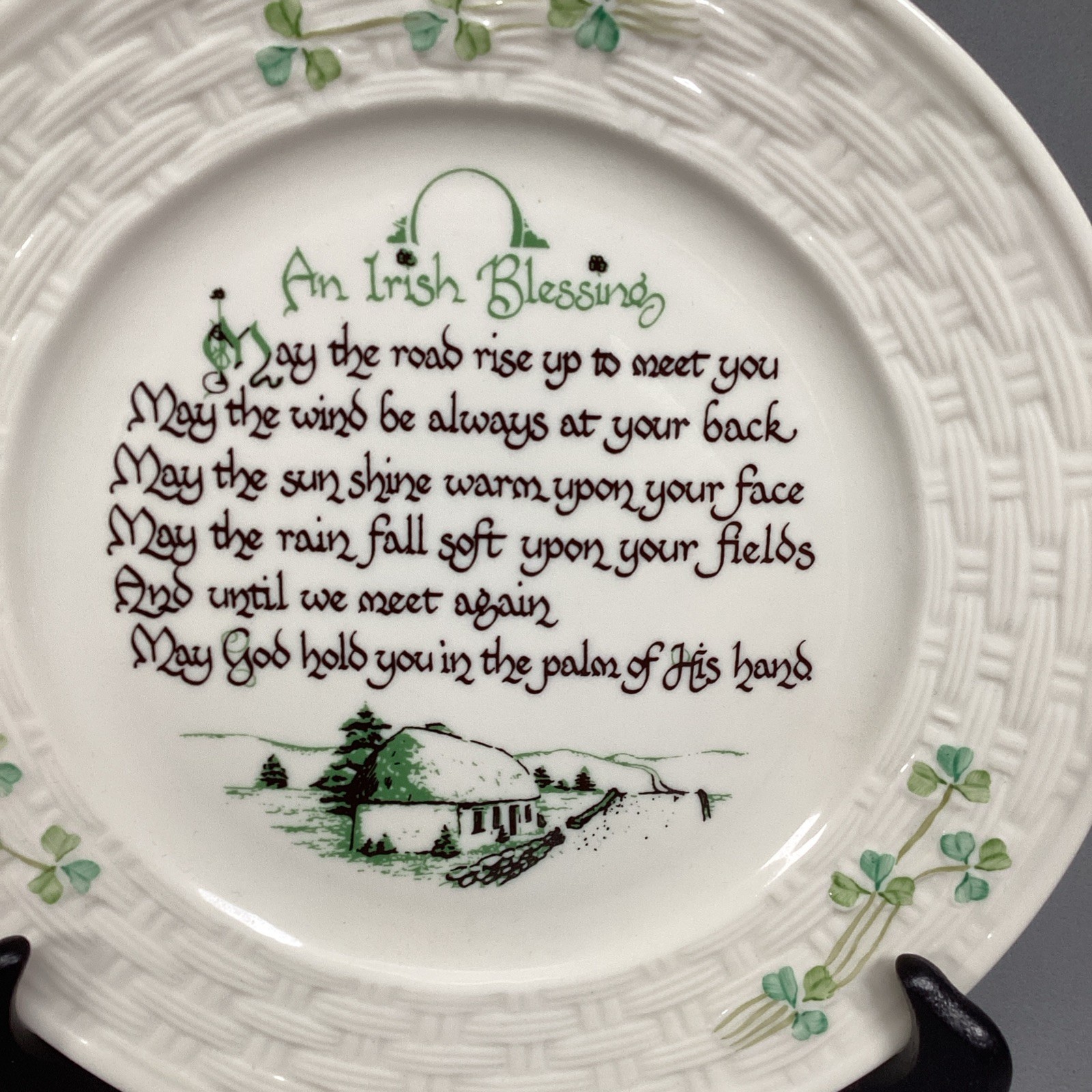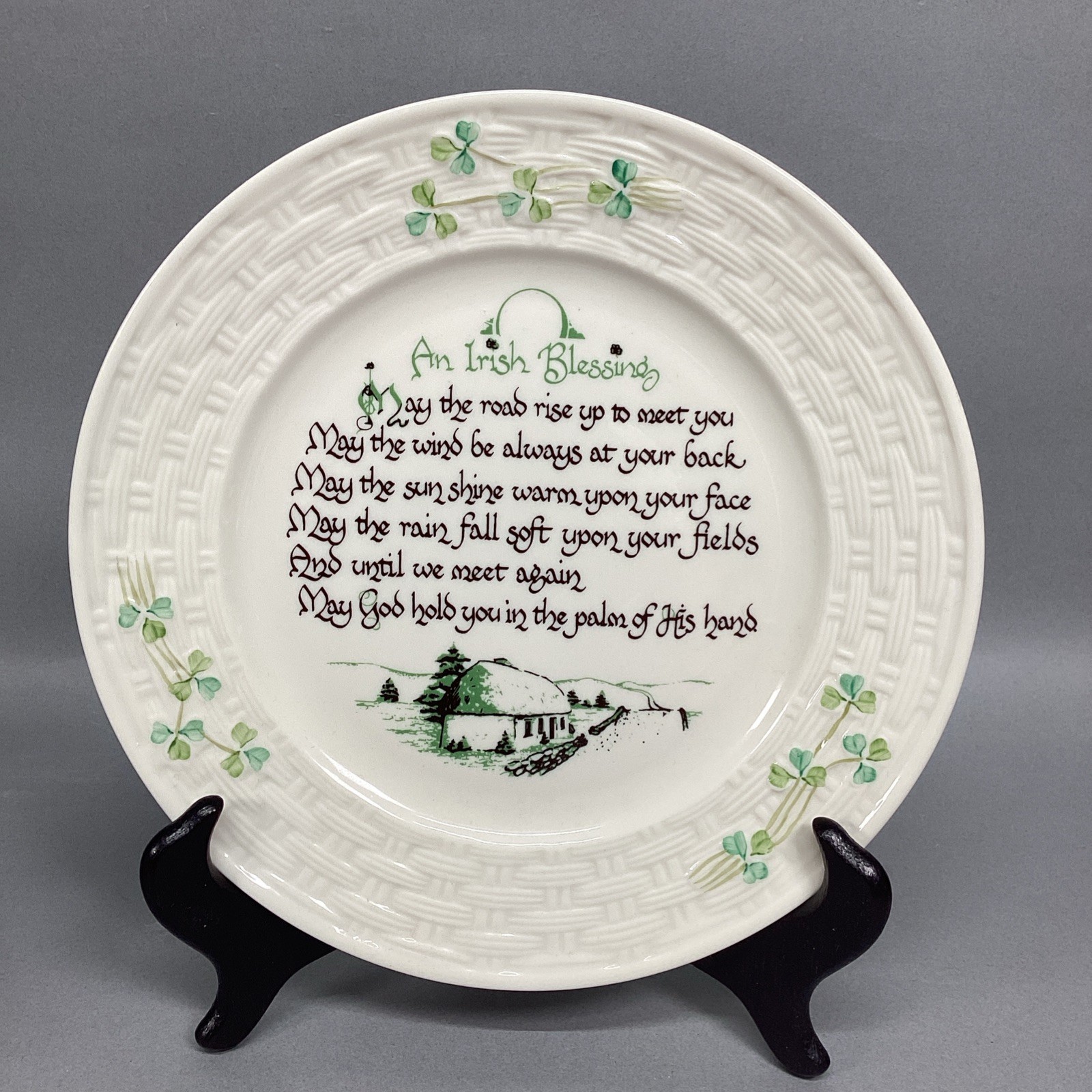 Vintage Belleek Porcelain 8.5? Irish Blessing Collector?s Shamrock Plate. In very good condition. The plate holder is Not included.
