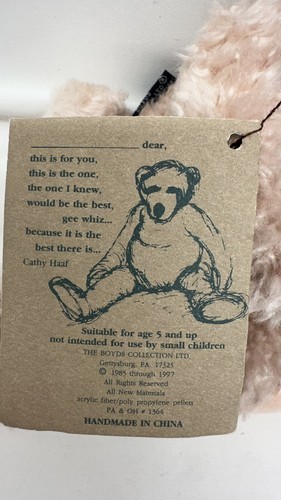 This vintage Boyds Bears stuffed animal is a charming addition to any collection. The 9-inch pink pig, named Lofton, has black eyes and a checkered bow tie made of beans, polyester, plush, and fake fur. This original piece from the 1990s is perfect for animal lovers or collectors of Boyds Bears. The pig comes from a smoke-free home and is ready for display or play.