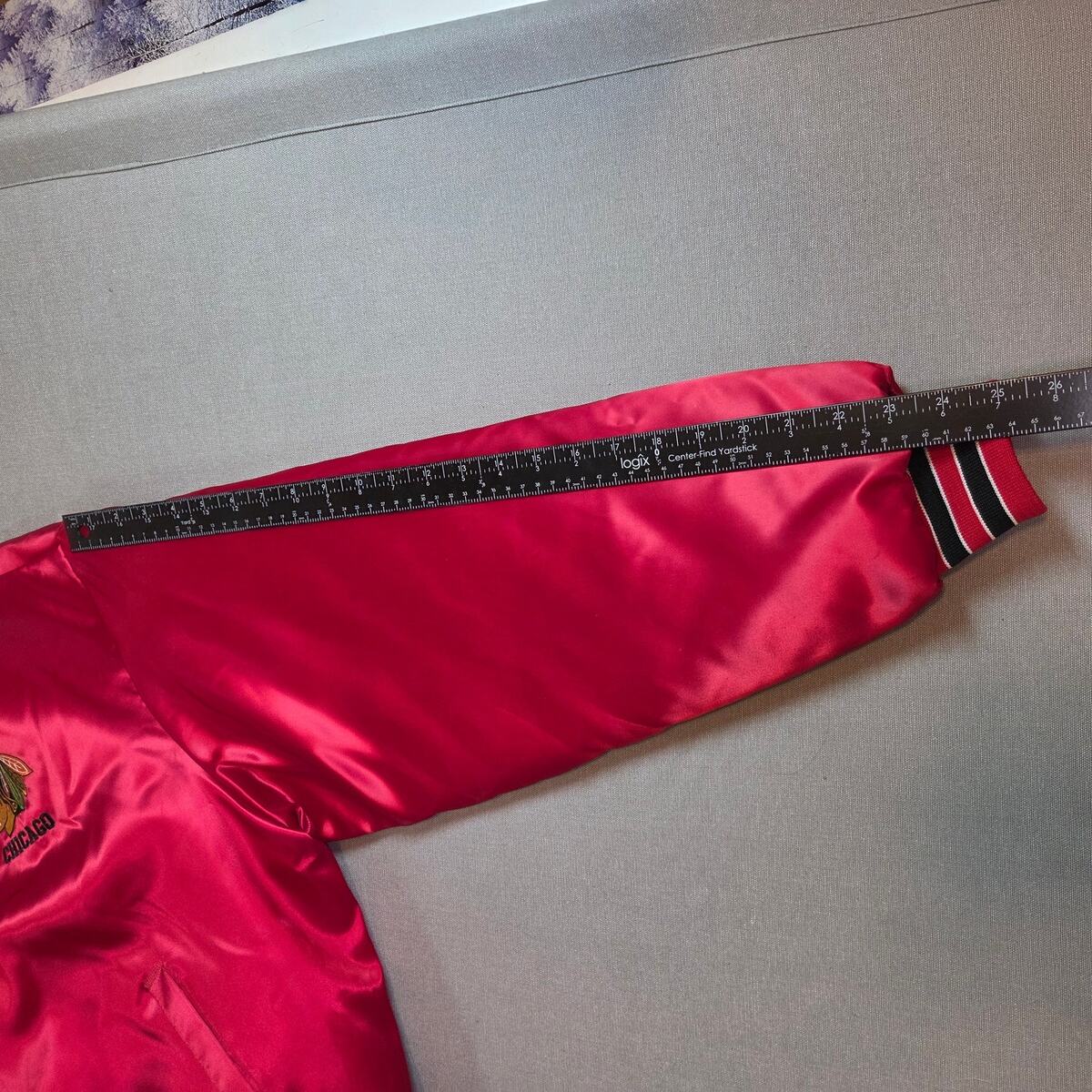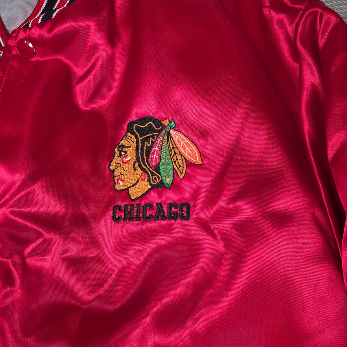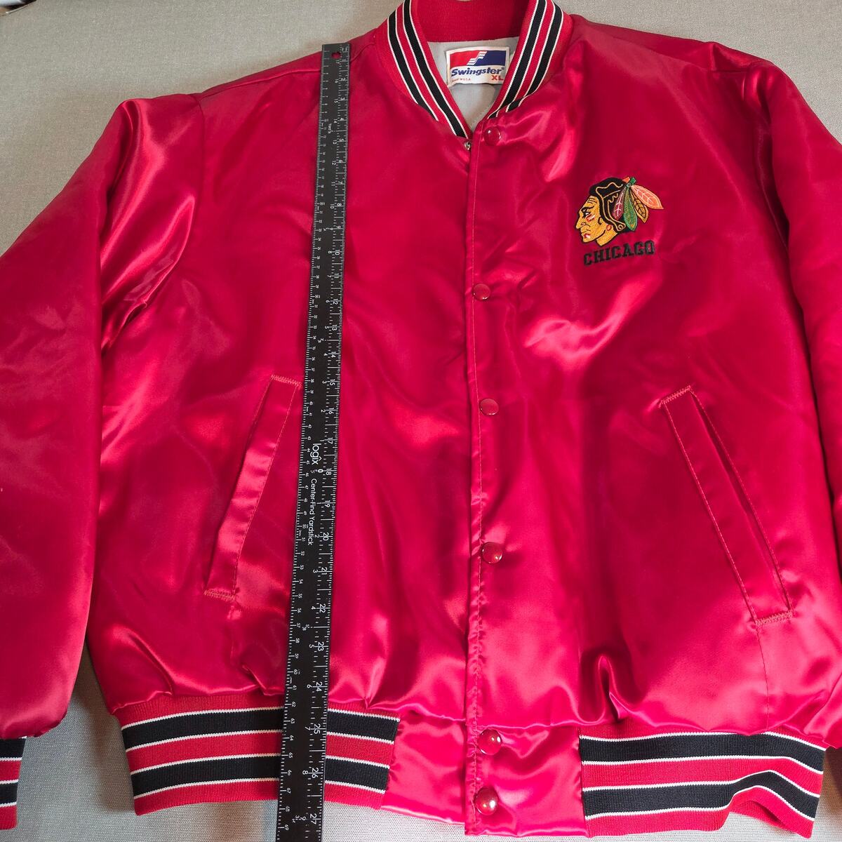 Vintage Swingster bomber jacket featuring the classic Chicago Blackhawks logo and quilted lining. Made in the USA and labeled size XL, this piece has that 80s/90s satin look and runs just a bit smaller than a modern XL, so please check the measurements. Excellent preowned condition with no major flaws noted and snap front closure working properly. Brand: Swingster Team: Chicago Blackhawks (NHL) Labeled size: XL (fits slightly smaller; see measurements) Approx. measurements: 26.5" length, 26" pit to pit, 25" sleeve Shell: 100% nylon; fill/lining: 100% polyester (per tags) Snap-front bomber style with quilted interior and striped rib knit collar, cuffs, and hem Two front welt pockets; inner condition clean with no obvious damage