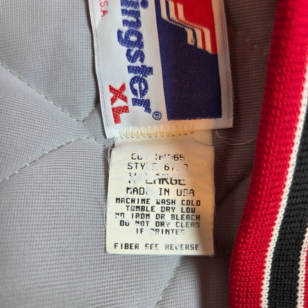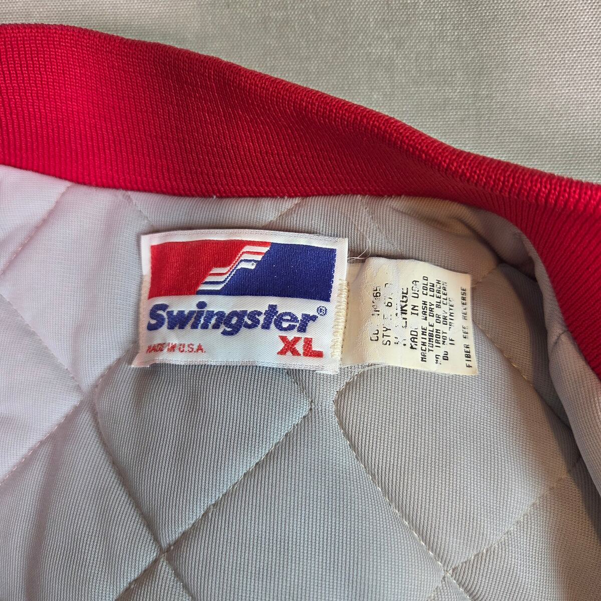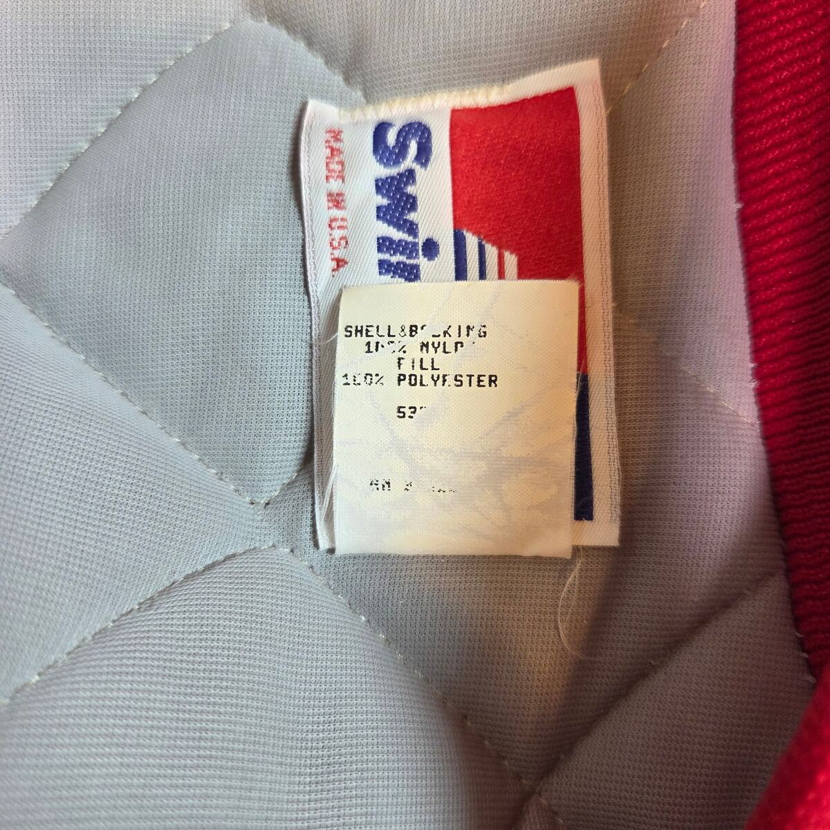 Vintage Swingster bomber jacket featuring the classic Chicago Blackhawks logo and quilted lining. Made in the USA and labeled size XL, this piece has that 80s/90s satin look and runs just a bit smaller than a modern XL, so please check the measurements. Excellent preowned condition with no major flaws noted and snap front closure working properly. Brand: Swingster Team: Chicago Blackhawks (NHL) Labeled size: XL (fits slightly smaller; see measurements) Approx. measurements: 26.5" length, 26" pit to pit, 25" sleeve Shell: 100% nylon; fill/lining: 100% polyester (per tags) Snap-front bomber style with quilted interior and striped rib knit collar, cuffs, and hem Two front welt pockets; inner condition clean with no obvious damage