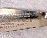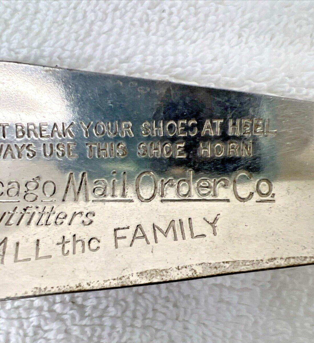 Vintage Chicago Mail Order Co Outfitters Metal Shoehorn Advertisement Shoe Horn the metal has wear and a few discolored spots about 4 1/4 inches long