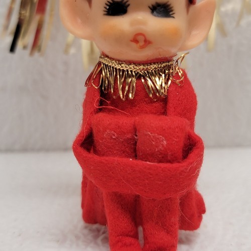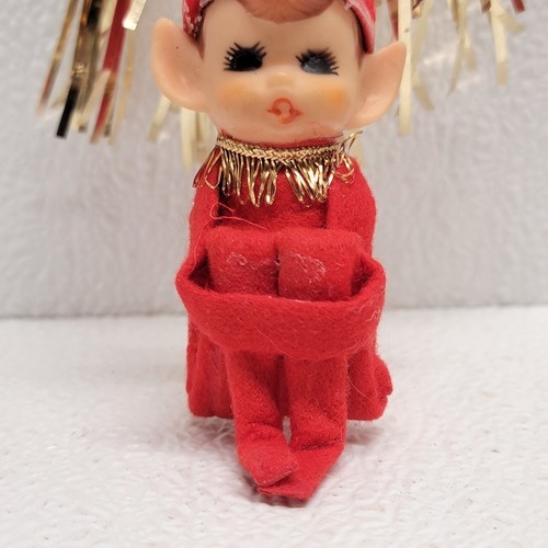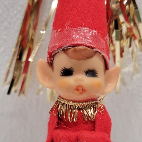 - Vintage Christmas Elf Pixie Knee Hugger Figure Tinsel Cone Hat Red & Gold