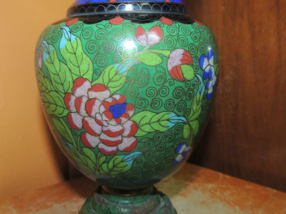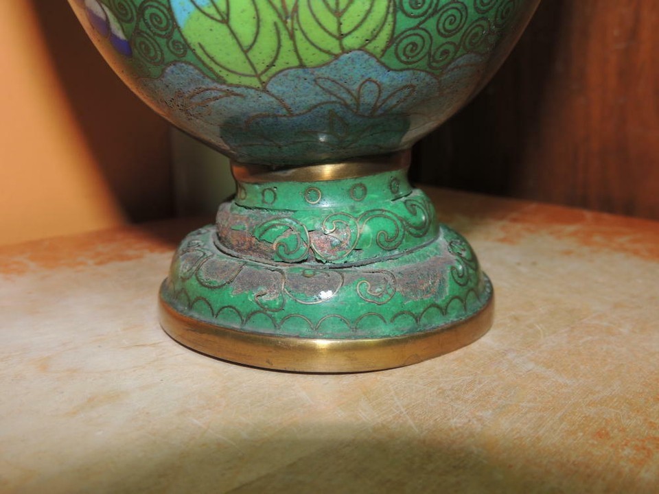 ONE DAMAGED CLOISONNE VASE, ENAMEL AND STONE OVER BRASS, OR PLATED COPPER. PLEASE LOOK AT THE PICTURES CAREFULLY AS I AM NOT AN ANTIQUITIES EXPERT.