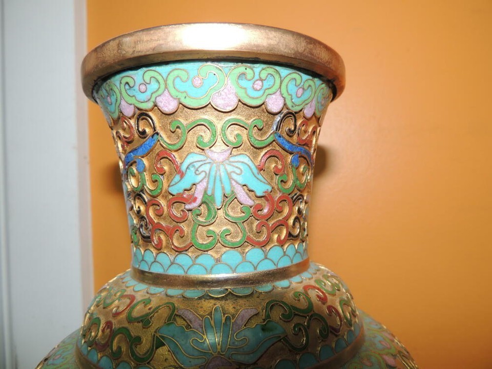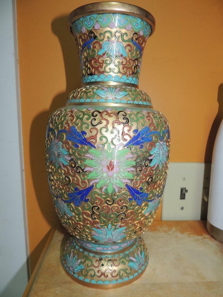 ONE CLOISONNE VASE, ENAMEL OVER BRASS, OR PLATED COPPER. PLEASE LOOK AT THE PICTURES CAREFULLY AS I AM NOT AN ANTIQUITIES EXPERT.