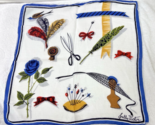 Primary image for Vintage Cotton Hankie Sally Victor Feathers Pincushion Blue Rose Scissor 14.5"