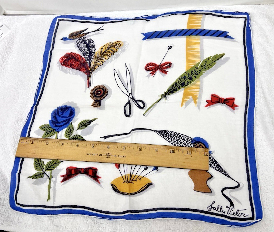 Vintage Cotton Hankie Sally Victor Feathers Pincushion Blue Rose Scissor 14.5 Inch In good shape no holes or stains