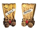 Pair of vintage ceramic salt and pepper shakers shaped like old-fashioned covered wagons. Each piece is hand-painted with a tan ?canvas? top, red lantern detail, and wagon wheel accents, labeled ?SALT? and ?PEPPER.? A fun nostalgic addition to any Western-themed kitchen or vintage collection.