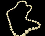 UP FOR SALE: This beautiful vintage beaded necklace features a strand of graduated round beads in a creamy tone reminiscent of faux ivory. The beads test UV reactive under black-light, suggesting a composition of early plastics such as Bakelite, Catalin, or Lucite, popular in mid-century fashion.