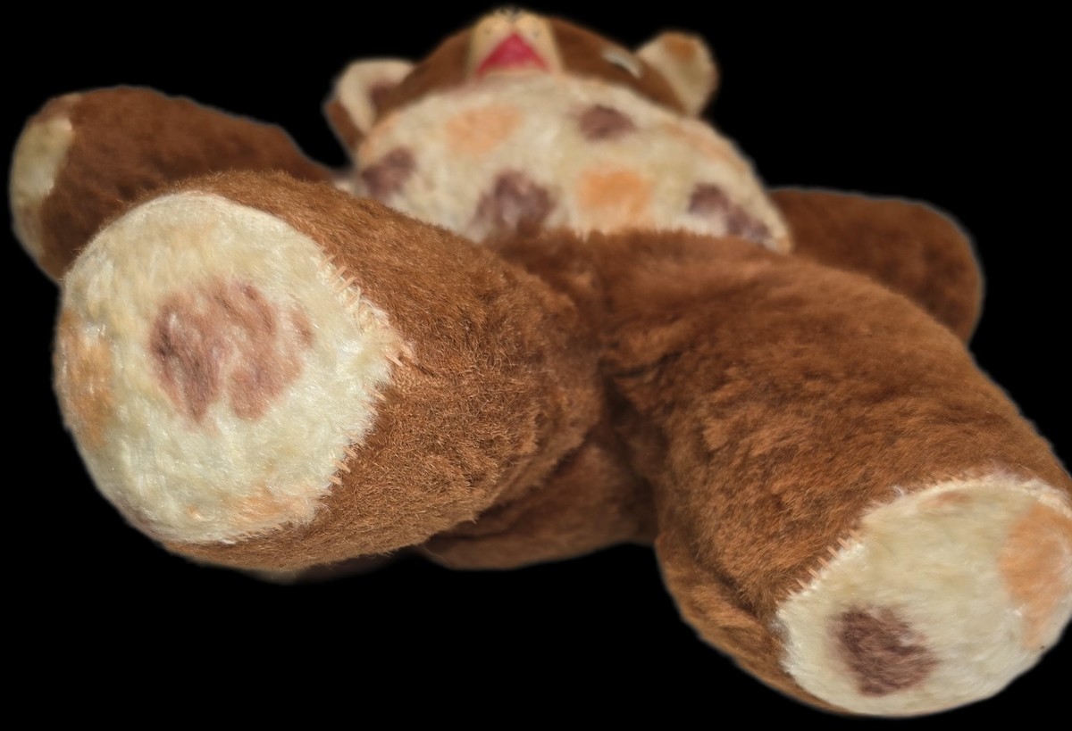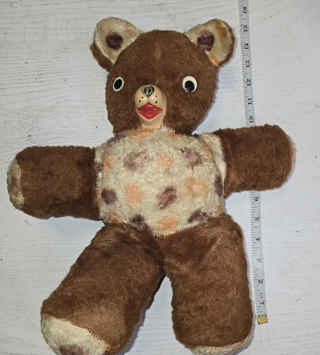 The Vintage Cubbi Gund Brown tan Polka Dot Teddy Bear Plush by Gund is a charming 14-inch stuffed animal from the 1950s. Made in the United States, this small-sized bear is a perfect addition to any teddy bear collection. With its unique brown and tan polka dot design and quality Gund brand, this plush bear is sure to delight children of all ages.